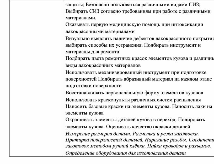 защиты; Безопасно пользоваться различными видами СИЗ; Выбирать СИЗ согласно требованиям при работе с различными материалами. Оказывать первую медицинскую помощь при интоксикации лакокрасочными материалами Визуально выявлять наличие дефектов лакокрасочного покрытия и выбирать способы их устранения. Подбирать инструмент и материалы для ремонта Подбирать цвета ремонтных красок элементов кузова и различные виды лакокрасочных материалов Использовать механизированный инструмент при подготовке поверхностей Подбирать абразивный материал на каждом этапе подготовки поверхности Восстанавливать первоначальную форму элементов кузовов Использовать краскопульты различных систем распыления Наносить базовые краски на элементы кузова. Наносить лаки на элементы кузова Окрашивать элементы деталей кузова в переход. Полировать элементы кузова. Оценивать качество окраски деталей Измерение размеров детали. Разметка и резка заготовки. Притирка поверхностей деталей. Нарезание резьбы. Соединение заготовок методом ручной клёпки. Пайка проводов и разъемов. Определение оборудования для изготовления детали |