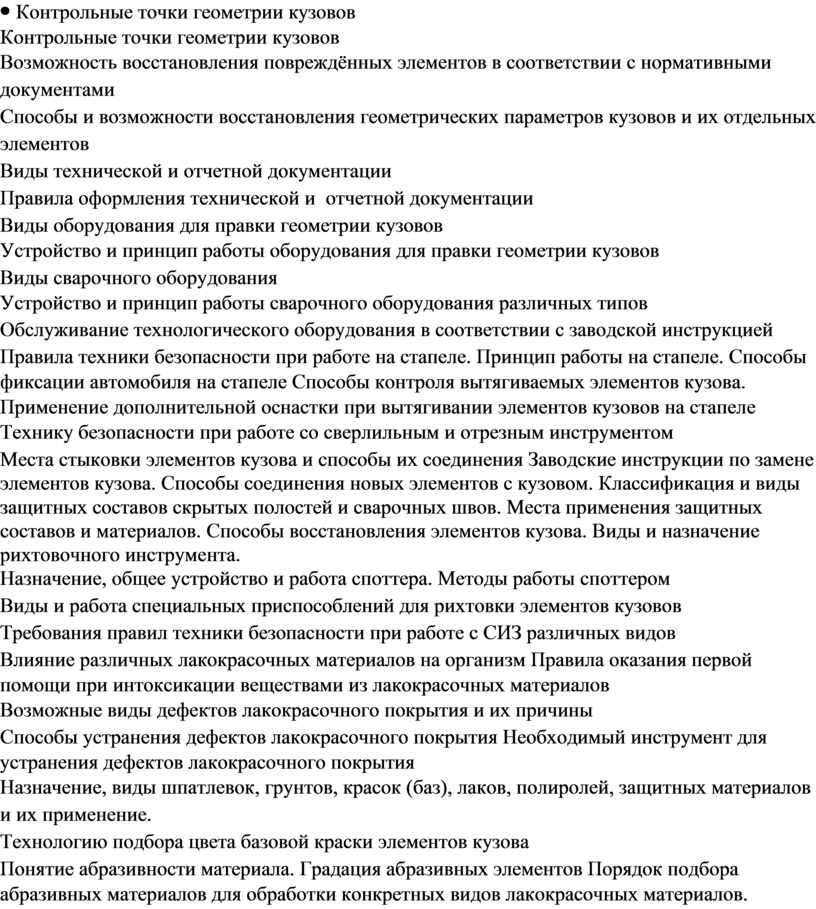 Контрольные точки геометрии кузовов Возможность восстановления повреждённых элементов в соответствии с нормативными документами Способы и возможности восстановления геометрических параметров кузовов и их отдельных элементов Виды технической и отчетной документации Правила оформления технической и отчетной документации Виды оборудования для правки геометрии кузовов Устройство и принцип работы оборудования для правки геометрии кузовов Виды сварочного оборудования Устройство и принцип работы сварочного оборудования различных типов Обслуживание технологического оборудования в соответствии с заводской инструкцией Правила техники безопасности при работе на стапеле. Принцип работы на стапеле. Способы фиксации автомобиля на стапеле Способы контроля вытягиваемых элементов кузова. Применение дополнительной оснастки при вытягивании элементов кузовов на стапеле Технику безопасности при работе со сверлильным и отрезным инструментом Места стыковки элементов кузова и способы их соединения Заводские инструкции по замене элементов кузова. Способы соединения новых элементов с кузовом. Классификация и виды защитных составов скрытых полостей и сварочных швов. Места применения защитных составов и материалов. Способы восстановления элементов кузова. Виды и назначение рихтовочного инструмента. Назначение, общее устройство и работа споттера. Методы работы споттером Виды и работа специальных приспособлений для рихтовки элементов кузовов Требования правил техники безопасности при работе с СИЗ различных видов Влияние различных лакокрасочных материалов на организм Правила оказания первой помощи при интоксикации веществами из лакокрасочных материалов Возможные виды дефектов лакокрасочного покрытия и их причины Способы устранения дефектов лакокрасочного покрытия Необходимый инструмент для устранения дефектов лакокрасочного покрытия Назначение, виды шпатлевок, грунтов, красок (баз), лаков, полиролей, защитных материалов и их применение. Технологию подбора цвета базовой краски элементов кузова Понятие абразивности материала. Градация абразивных элементов Порядок подбора абразивных материалов для обработки конкретных видов лакокрасочных материалов. Назначение, устройство и работа шлифовальных машин. Способы контроля качества подготовки поверхностей. Виды, устройство и принцип работы краскопультов различных конструкций. Технологию нанесения базовых красок. Технологию нанесения лаков. Технологию окраски элементов кузова методом |