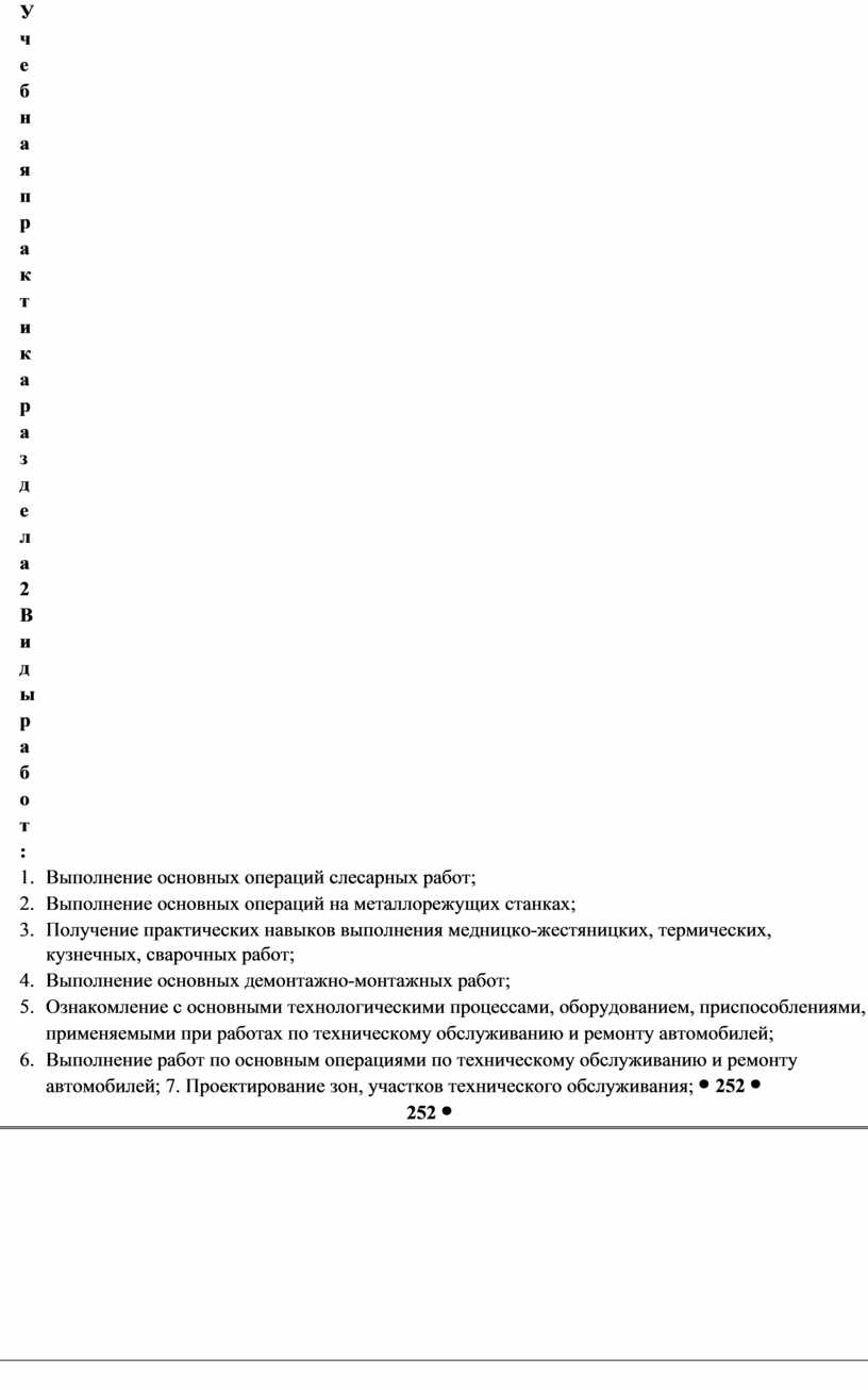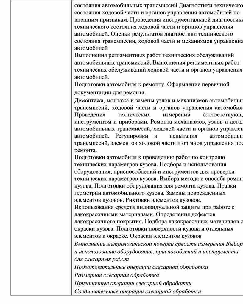 состояния автомобильных трансмиссий Диагностики технического состояния ходовой части и органов управления автомобилей по внешним признакам. Проведения инструментальной диагностики технического состояния ходовой части и органов управления автомобилей. Оценки результатов диагностики технического состояния трансмиссии, ходовой части и механизмов управления автомобилей Выполнения регламентных работ технических обслуживаний автомобильных трансмиссий. Выполнения регламентных работ технических обслуживаний ходовой части и органов управления автомобилей. Подготовки автомобиля к ремонту. Оформление первичной документации для ремонта. Демонтажа, монтажа и замены узлов и механизмов автомобильных трансмиссий, ходовой части и органов управления автомобилей. Проведения технических измерений соответствующим инструментом и приборами. Ремонта механизмов, узлов и деталей автомобильных трансмиссий, ходовой части и органов управления автомобилей. Регулировки и испытания автомобильных трансмиссий, элементов ходовой части и органов управления после ремонта. Подготовки автомобиля к проведению работ по контролю технических параметров кузова. Подбора и использования оборудования, приспособлений и инструментов для проверки технических параметров кузова. Выбора метода и способа ремонта кузова. Подготовки оборудования для ремонта кузова. Правки геометрии автомобильного кузова. Замены поврежденных элементов кузовов. Рихтовки элементов кузовов. Использования средств индивидуальной защиты при работе с лакокрасочными материалами. Определения дефектов лакокрасочного покрытия. Подбора лакокрасочных материалов для окраски кузова. Подготовки поверхности кузова и отдельных элементов к окраске. Окраски элементов кузовов Выполнение метрологической поверки средств измерения Выбор и использование оборудования, приспособлений и инструмента для слесарных работ Подготовительные операции слесарной обработки Размерная слесарная обработка Пригоночные операции слесарной обработки Соединительные операции слесарной обработки |