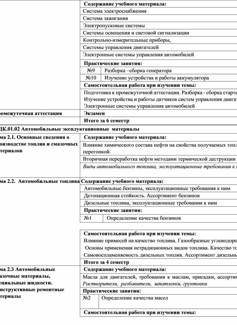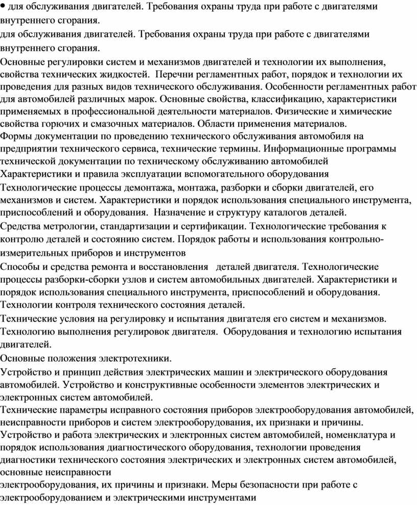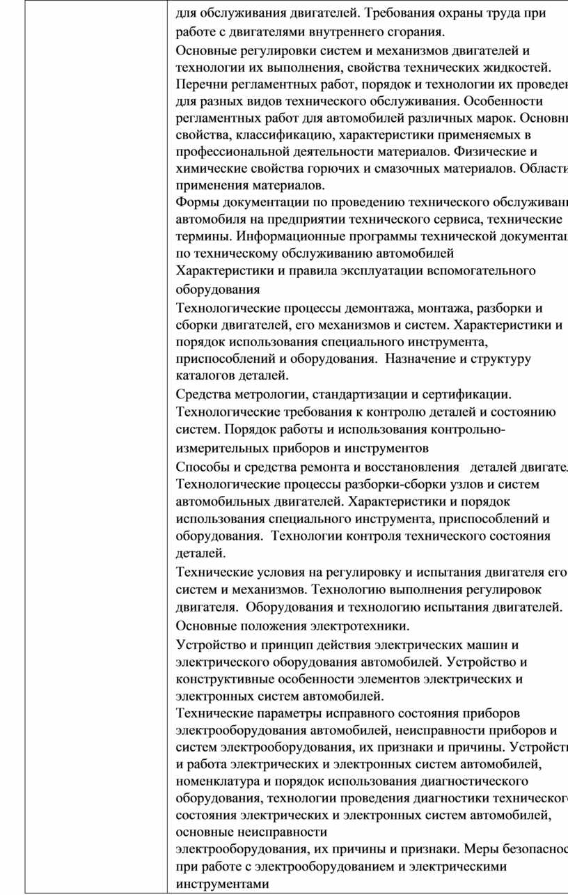 для обслуживания двигателей. Требования охраны труда при работе с двигателями внутреннего сгорания. Основные регулировки систем и механизмов двигателей и технологии их выполнения, свойства технических жидкостей. Перечни регламентных работ, порядок и технологии их проведения для разных видов технического обслуживания. Особенности регламентных работ для автомобилей различных марок. Основные свойства, классификацию, характеристики применяемых в профессиональной деятельности материалов. Физические и химические свойства горючих и смазочных материалов. Области применения материалов. Формы документации по проведению технического обслуживания автомобиля на предприятии технического сервиса, технические термины. Информационные программы технической документации по техническому обслуживанию автомобилей Характеристики и правила эксплуатации вспомогательного оборудования Технологические процессы демонтажа, монтажа, разборки и сборки двигателей, его механизмов и систем. Характеристики и порядок использования специального инструмента, приспособлений и оборудования. Назначение и структуру каталогов деталей. Средства метрологии, стандартизации и сертификации. Технологические требования к контролю деталей и состоянию систем. Порядок работы и использования контрольно- измерительных приборов и инструментов Способы и средства ремонта и восстановления деталей двигателя. Технологические процессы разборки-сборки узлов и систем автомобильных двигателей. Характеристики и порядок использования специального инструмента, приспособлений и оборудования. Технологии контроля технического состояния деталей. Технические условия на регулировку и испытания двигателя его систем и механизмов. Технологию выполнения регулировок двигателя. Оборудования и технологию испытания двигателей. Основные положения электротехники. Устройство и принцип действия электрических машин и электрического оборудования автомобилей. Устройство и конструктивные особенности элементов электрических и электронных систем автомобилей. Технические параметры исправного состояния приборов электрооборудования автомобилей, неисправности приборов и систем электрооборудования, их признаки и причины. Устройство и работа электрических и электронных систем автомобилей, номенклатура и порядок использования диагностического оборудования, технологии проведения диагностики технического состояния электрических и электронных систем автомобилей, основные неисправности электрооборудования, их причины и признаки. Меры безопасности при работе с электрооборудованием и электрическими инструментами Неисправности электрических и электронных систем, их признаки и способы выявления по результатам органолептической и инструментальной диагностики, методики определения |