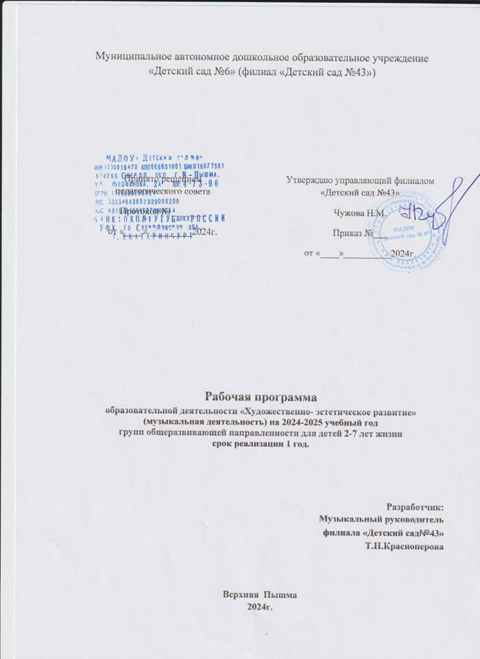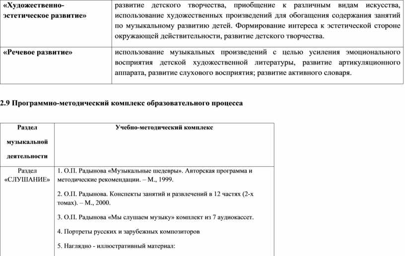Особенностью рабочей программы по музыкальному воспитанию и развитию дошкольников является взаимосвязь различных видов художественной деятельности: речевой, музыкальной, песенной, танцевальной, творческо-игровой.