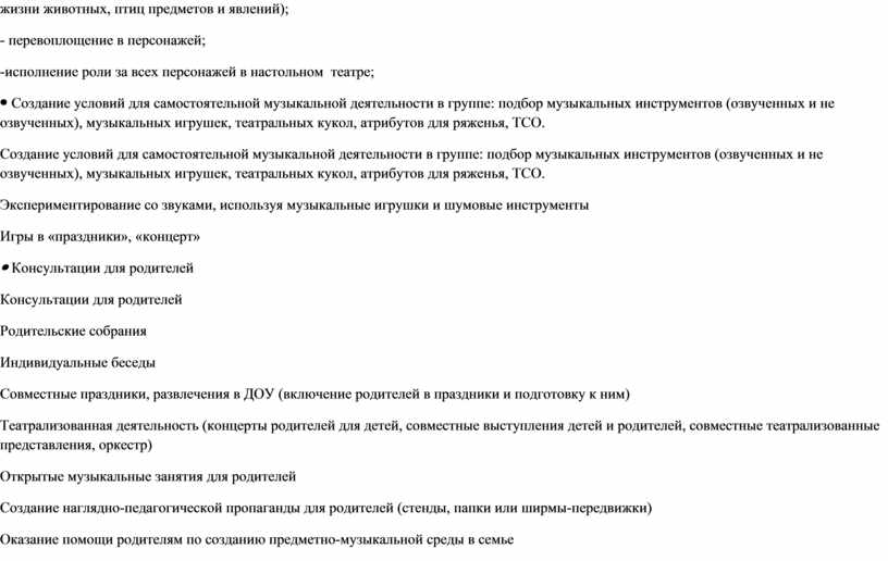 Изучение предложений педагогов по планированию музыкальной деятельности с учетом материально – технической и методической базы, уровня возможностей детей, программы музыкального воспитания и плана учебно-воспитательной работы детского сада. |