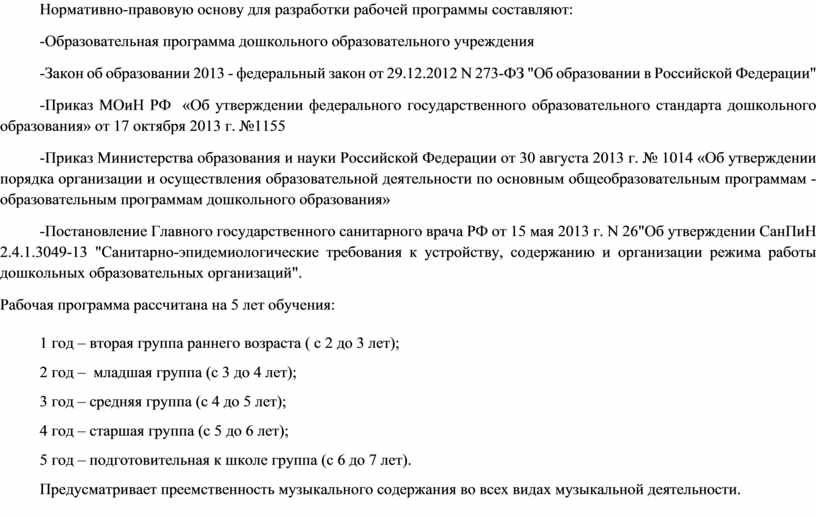 -Закон об образовании 2013 - федеральный закон от 29.12.2012 N 273-ФЗ "Об образовании в Российской Федерации" -Приказ МОиН РФ «Об утверждении федерального государственного образовательного стандарта дошкольного образования» от 17 октября 2013 г. №1155 -Приказ Министерства образования и науки Российской Федерации от 30 августа 2013 г. № 1014 «Об утверждении порядка организации и осуществления образовательной деятельности по основным общеобразовательным программам - образовательным программам дошкольного образования» -Постановление Главного государственного санитарного врача РФ от 15 мая 2013 г. N 26"Об утверждении СанПиН 2.4.1.3049-13 "Санитарно-эпидемиологические требования к устройству, содержанию и организации режима работы дошкольных образовательных организаций".