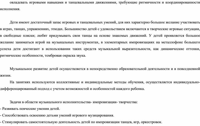 - развивать способность к песенному, музыкально-игровому, танцевальному творчеству, к импровизации на детских музыкальных инструментах.