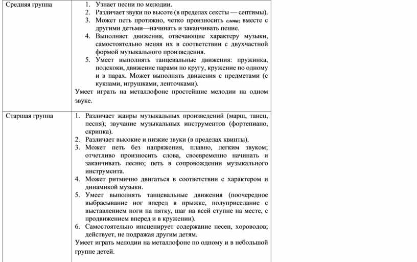 1. Узнает мелодию Государственного гимна РФ. 2. Определяет жанр прослушанного произведения (марш, песня, танец) и инструмент, на котором оно исполняется. 3. Определяет общее настроение, характер музыкального произведения. 4. Различает части музыкального произведения (вступление, заключение, запев, припев). 5. Может петь песни в удобном диапазоне, исполняя их выразительно, правильно передавая мелодию (ускоряя, замедляя, усиливая и ослабляя звучание). 6. Может петь индивидуально и коллективно, с сопровождением и без него. 7. Умеет выразительно и ритмично двигаться в соответствии с разнообразным характером музыки, музыкальными образами; передавать несложный музыкальный ритмический рисунок. 8. Умеет выполнять танцевальные движения (шаг с притопом, приставной шаг с приседанием, пружинящий шаг, боковой галоп, переменный шаг). 9. Инсценирует игровые песни, придумывает варианты образных движений в играх и хороводах. Исполняет сольно и в ансамбле на ударных и