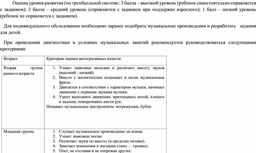 При проведении диагностики в условиях музыкальных занятий рекомендуется руководствоваться следующими критериями:
