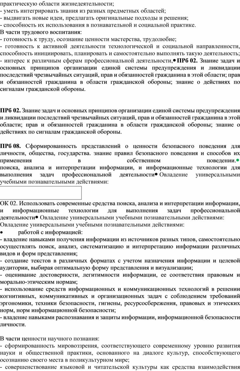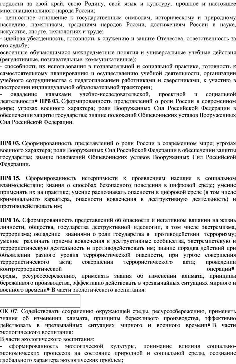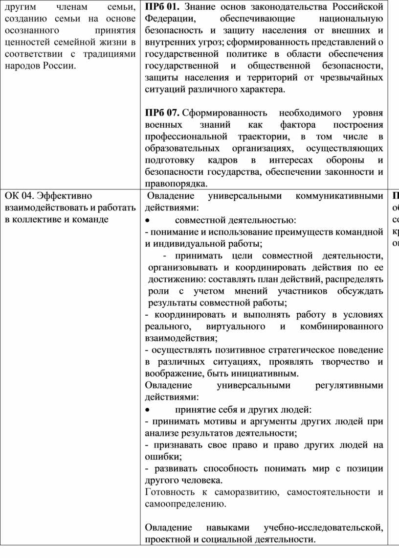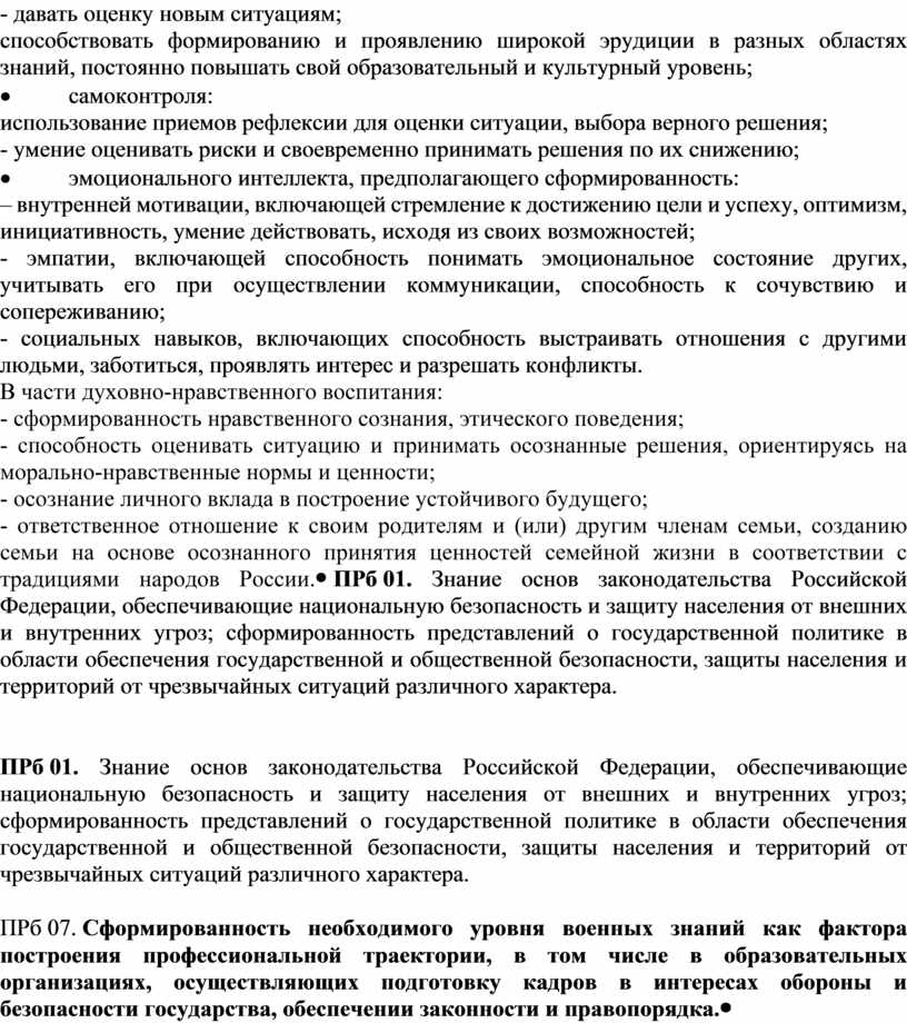 ПРб 01. Знание основ законодательства Российской Федерации, обеспечивающие национальную безопасность и защиту населения от внешних и внутренних угроз; сформированность представлений о государственной политике в области обеспечения государственной и общественной безопасности, защиты населения и территорий от чрезвычайных ситуаций различного характера. ПРб 07. Сформированность необходимого уровня военных знаний как фактора построения профессиональной траектории, в том числе в образовательных организациях, осуществляющих подготовку кадров в интересах обороны и безопасности государства, обеспечении законности и правопорядка. |