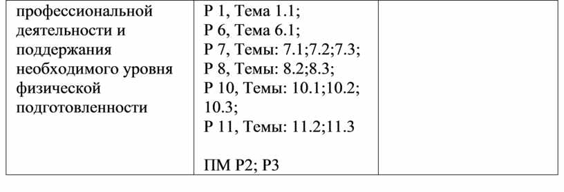 Р 1, Тема 1.1; Р 2, Тема 2.1; Р 3, Темы: 3.1; 3.2; Р 4, Темы: 4.1; 4.2; Р 6, Темы: 6.1;6.2; Р 8, Темы: 8.2;8.3; Р 11, Темы: 11.1; 11.3