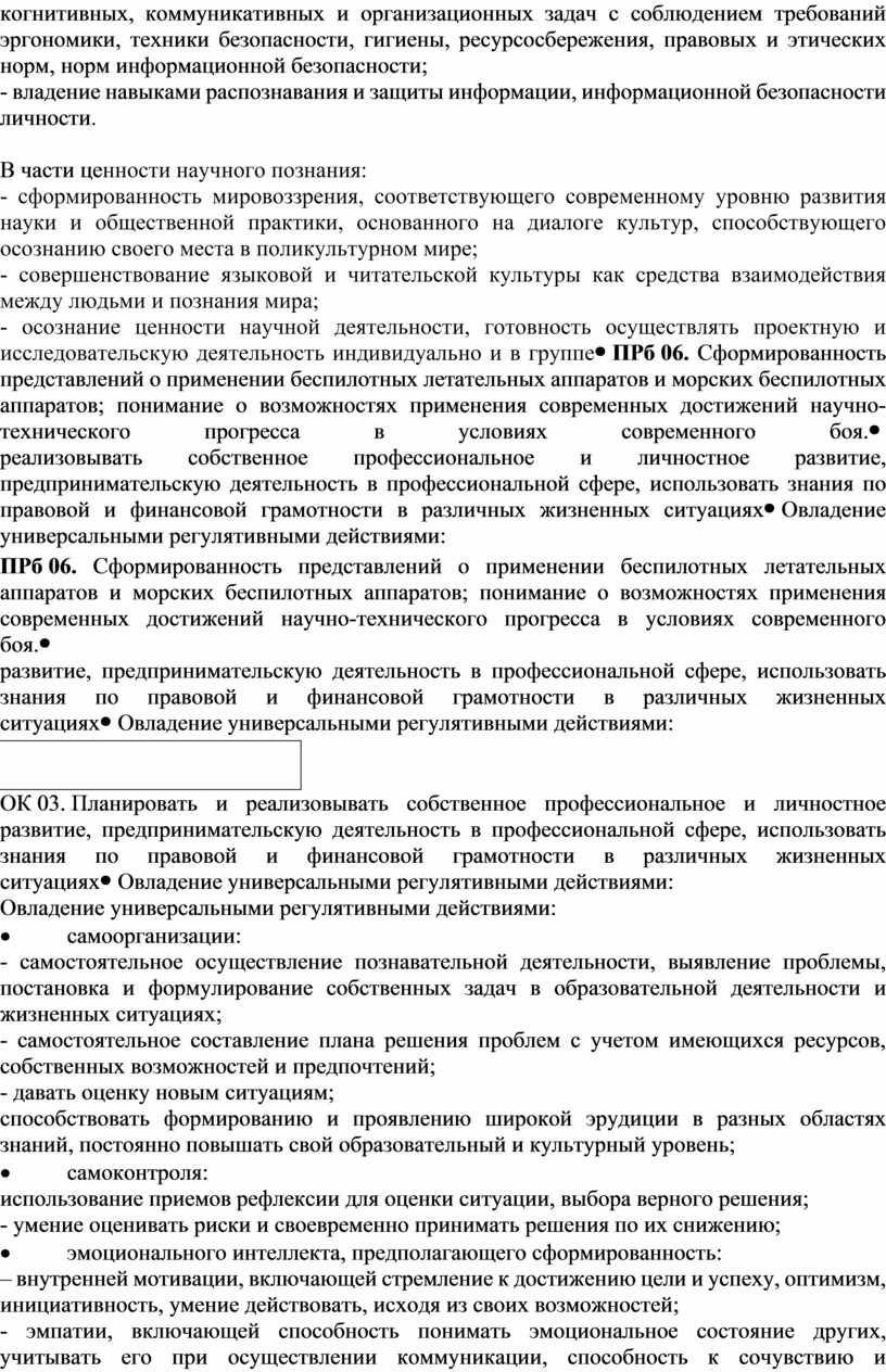 ПРб 06. Сформированность представлений о применении беспилотных летательных аппаратов и морских беспилотных аппаратов; понимание о возможностях применения современных достижений научно-технического прогресса в условиях современного боя. |