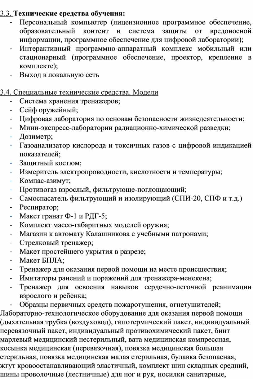 Эффективность преподавания курса «Основы безопасности и защиты Родины» зависит от наличия соответствующего материально-технического оснащения. Это объясняется особенностями курса, в первую очередь, его многопрофильностью и практической направленностью. Материально-техническое обеспечение кабинета ОБЗР включает: нормативные документы (в актуальной редакции); плакаты/стенды; технические средства обучения; специальные технические средства (модели). Кроме того, необходимо наличие площадок для практических занятий. Учебно-методическое обеспечение реализации программы должно соответствовать действующему законодательству.