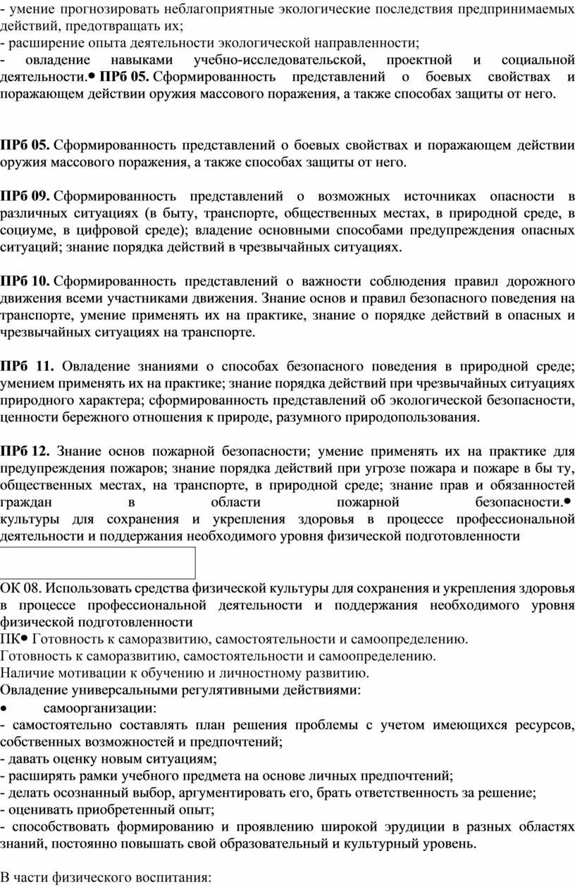 ПРб 05. Сформированность представлений о боевых свойствах и поражающем действии оружия массового поражения, а также способах защиты от него. ПРб 09. Сформированность представлений о возможных источниках опасности в различных ситуациях (в быту, транспорте, общественных местах, в природной среде, в социуме, в цифровой среде); владение основными способами предупреждения опасных ситуаций; знание порядка действий в чрезвычайных ситуациях. ПРб 10. Сформированность представлений о важности соблюдения правил дорожного движения всеми участниками движения. Знание основ и правил безопасного поведения на транспорте, умение применять их на практике, знание о порядке действий в опасных и чрезвычайных ситуациях на транспорте. ПРб 11. Овладение знаниями о способах безопасного поведения в природной среде; умением применять их на практике; знание порядка действий при чрезвычайных ситуациях природного характера; сформированность представлений об экологической безопасности, ценности бережного отношения к природе, разумного природопользования. ПРб 12. Знание основ пожарной безопасности; умение применять их на практике для предупреждения пожаров; знание порядка действий при угрозе пожара и пожаре в бы ту, общественных местах, на транспорте, в природной среде; знание прав и обязанностей граждан в области пожарной безопасности. |