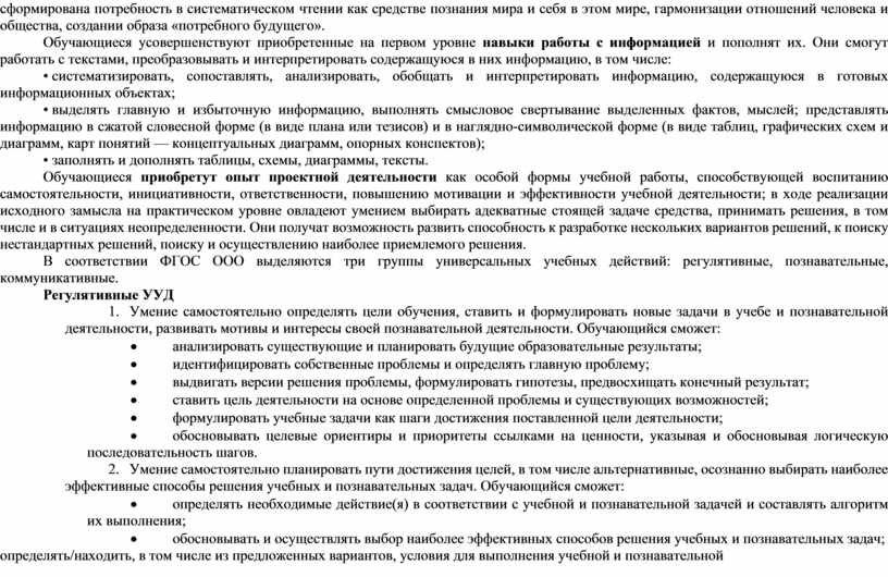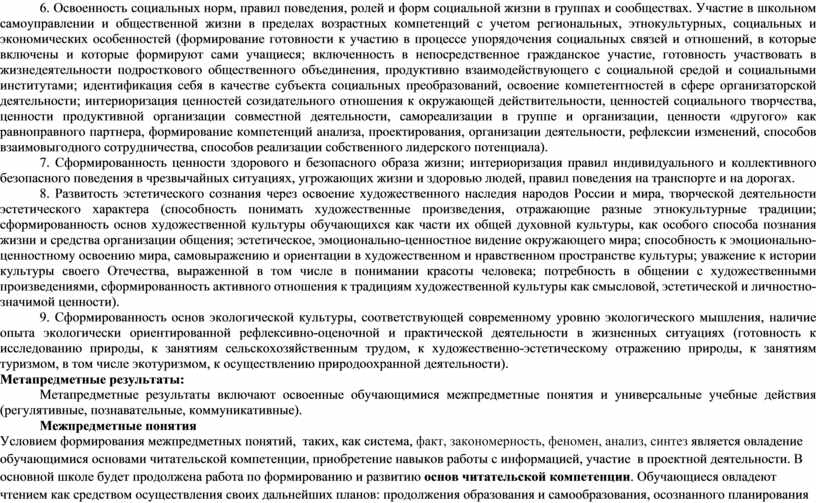 Условием формирования межпредметных понятий, таких, как система, факт, закономерность, феномен, анализ, синтез является овладение обучающимися основами читательской компетенции, приобретение навыков работы с информацией, участие в проектной деятельности. В основной школе будет продолжена работа по формированию и развитию основ читательской компетенции. Обучающиеся овладеют чтением как средством осуществления своих дальнейших планов: продолжения образования и самообразования, осознанного планирования своего актуального и перспективного круга чтения, в том числе досугового, подготовки к трудовой и социальной деятельности. У выпускников будет сформирована потребность в систематическом чтении как средстве познания мира и себя в этом мире, гармонизации отношений человека и общества, создании образа «потребного будущего».