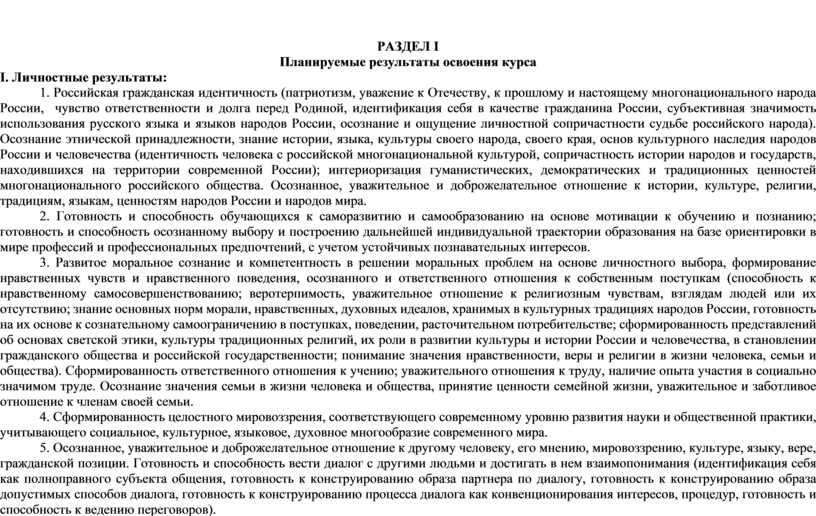 1. Российская гражданская идентичность (патриотизм, уважение к Отечеству, к прошлому и настоящему многонационального народа России, чувство ответственности и долга перед Родиной, идентификация себя в качестве гражданина России, субъективная значимость использования русского языка и языков народов России, осознание и ощущение личностной сопричастности судьбе российского народа). Осознание этнической принадлежности, знание истории, языка, культуры своего народа, своего края, основ культурного наследия народов России и человечества (идентичность человека с российской многонациональной культурой, сопричастность истории народов и государств, находившихся на территории современной России); интериоризация гуманистических, демократических и традиционных ценностей многонационального российского общества. Осознанное, уважительное и доброжелательное отношение к истории, культуре, религии, традициям, языкам, ценностям народов России и народов мира.