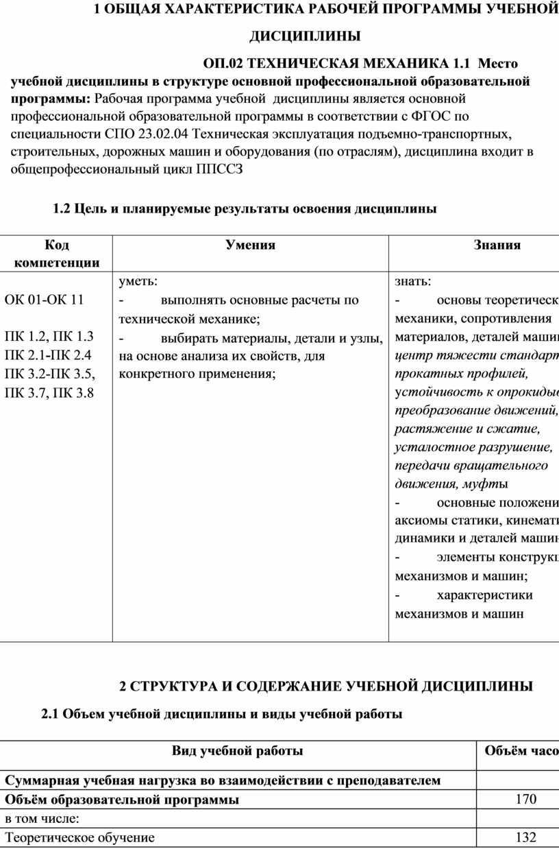ОП.02 ТЕХНИЧЕСКАЯ МЕХАНИКА 1.1 Место учебной дисциплины в структуре основной профессиональной образовательной программы: Рабочая программа учебной дисциплины является основной профессиональной образовательной программы в соответствии с ФГОС по специальности СПО 23.02.04 Техническая эксплуатация подъемно-транспортных, строительных, дорожных машин и оборудования (по отраслям), дисциплина входит в общепрофессиональный цикл ППССЗ