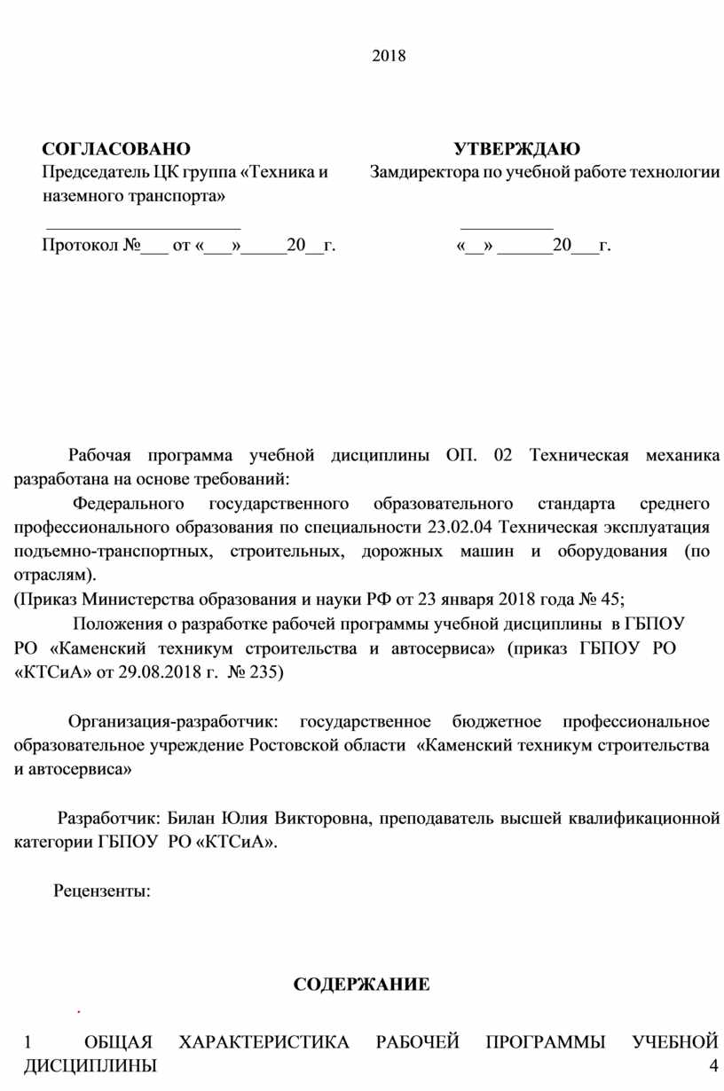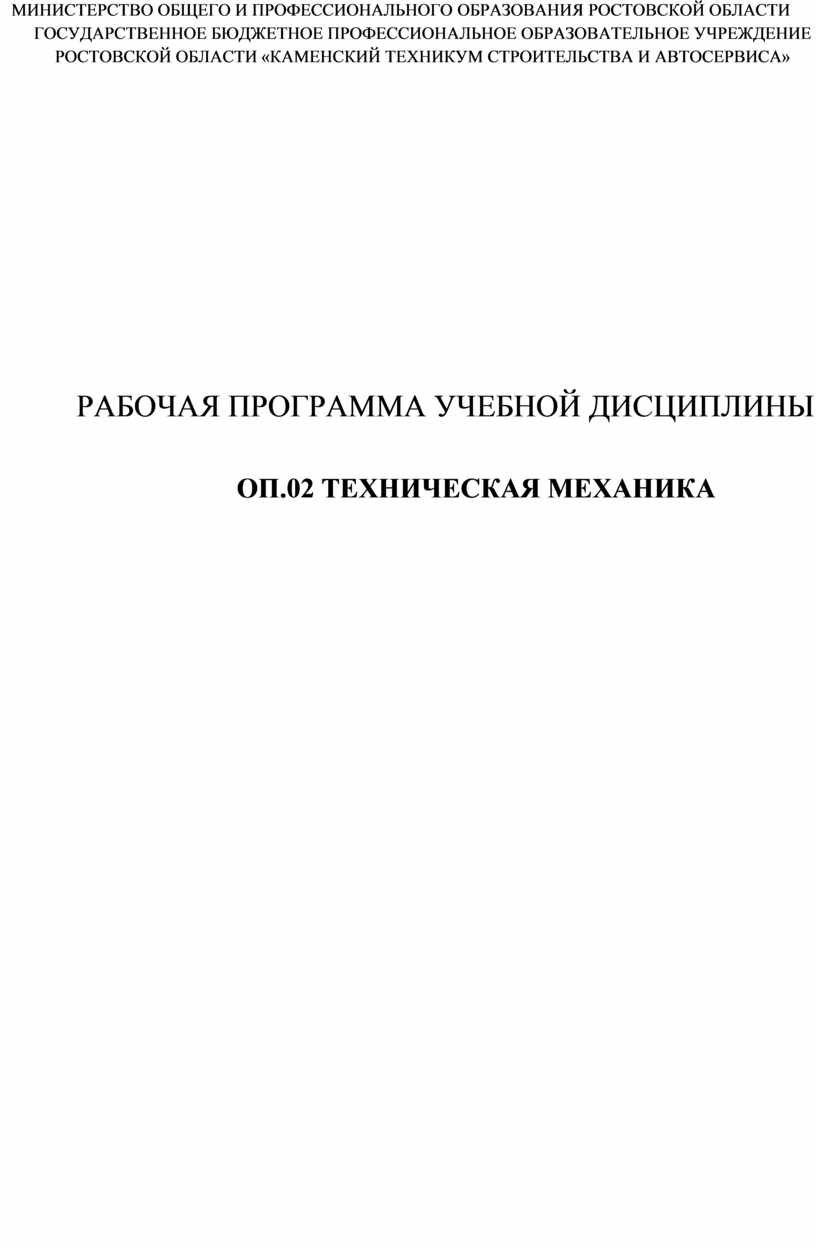 Рабочая программа учебной дисциплины ОП. 02 Техническая механика разработана на основе требований: