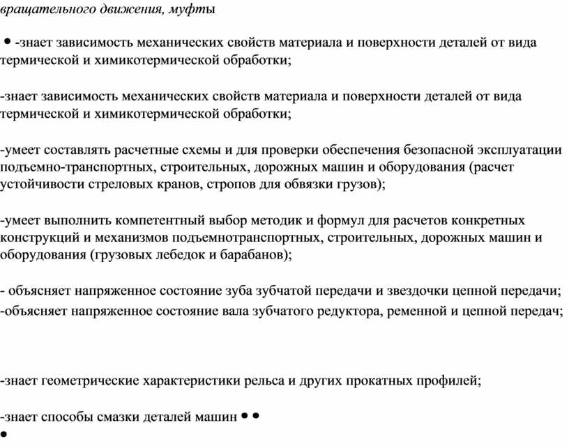 -знает зависимость механических свойств материала и поверхности деталей от вида термической и химикотермической обработки; -умеет составлять расчетные схемы и для проверки обеспечения безопасной эксплуатации подъемно-транспортных, строительных, дорожных машин и оборудования (расчет устойчивости стреловых кранов, стропов для обвязки грузов); -умеет выполнить компетентный выбор методик и формул для расчетов конкретных конструкций и механизмов подъемнотранспортных, строительных, дорожных машин и оборудования (грузовых лебедок и барабанов); - объясняет напряженное состояние зуба зубчатой передачи и звездочки цепной передачи; -объясняет напряженное состояние вала зубчатого редуктора, ременной и цепной передач;