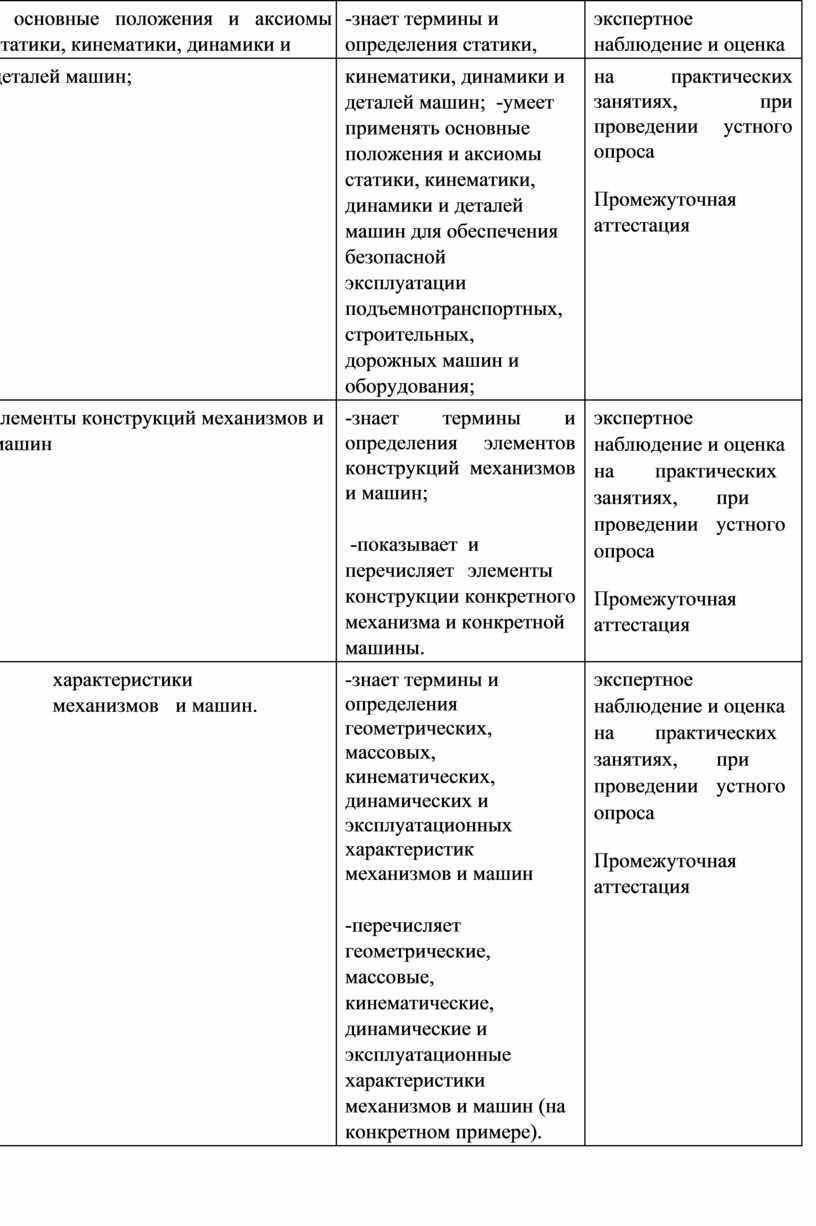 кинематики, динамики и деталей машин; -умеет применять основные положения и аксиомы статики, кинематики, динамики и деталей машин для обеспечения безопасной эксплуатации подъемнотранспортных, строительных, дорожных машин и оборудования; |