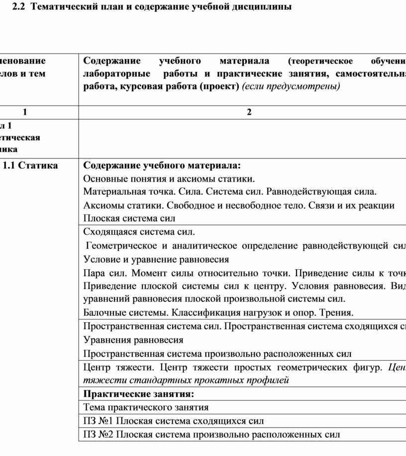 Содержание учебного материала: Основные понятия и аксиомы статики. Материальная точка. Сила. Система сил. Равнодействующая сила. Аксиомы статики. Свободное и несвободное тело. Связи и их реакции Плоская система сил |