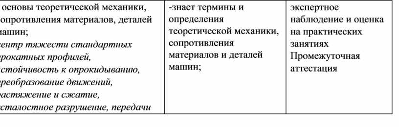 знать: - основы теоретической механики, сопротивления материалов, деталей машин, центр тяжести стандартных прокатных профилей, устойчивость к опрокидыванию, преобразование движений, растяжение и сжатие, усталостное разрушение, передачи вращательного движения, муфты - основные положения и аксиомы статики, кинематики, динамики и деталей машин; - элементы конструкций механизмов и машин; - характеристики механизмов и машин