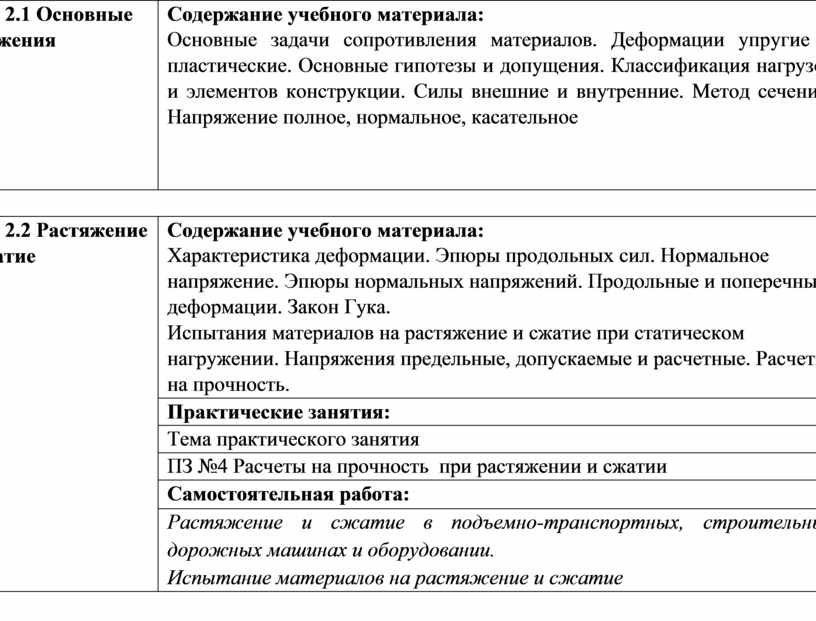 Содержание учебного материала: Характеристика деформации. Эпюры продольных сил. Нормальное напряжение. Эпюры нормальных напряжений. Продольные и поперечные деформации. Закон Гука. Испытания материалов на растяжение и сжатие при статическом нагружении. Напряжения предельные, допускаемые и расчетные. Расчеты на прочность. |