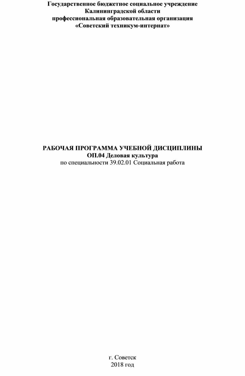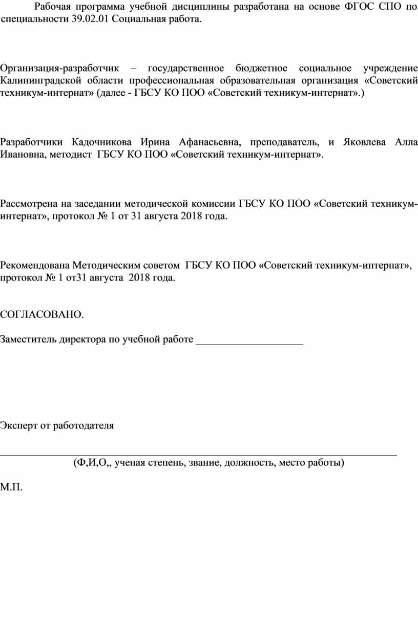 Рабочая программа учебной дисциплины разработана на основе ФГОС СПО по специальности 39.02.01 Социальная работа.