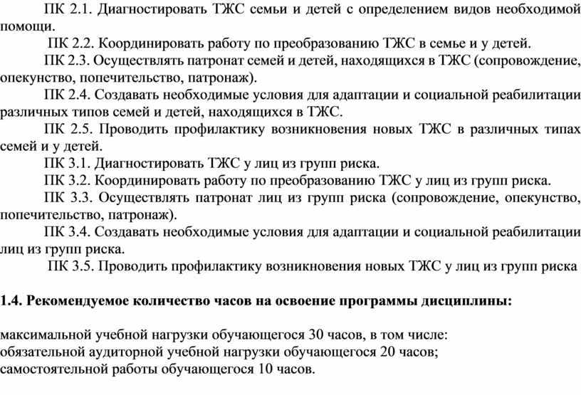 ПК 2.4. Создавать необходимые условия для адаптации и социальной реабилитации различных типов семей и детей, находящихся в ТЖС.