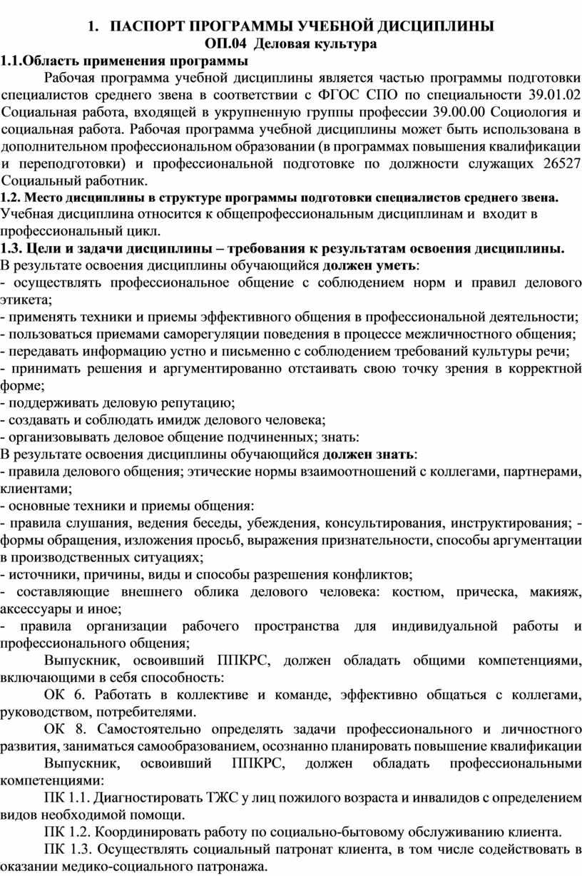 Рабочая программа учебной дисциплины является частью программы подготовки специалистов среднего звена в соответствии с ФГОС СПО по специальности 39.01.02 Социальная работа, входящей в укрупненную группы профессии 39.00.00 Социология и социальная работа. Рабочая программа учебной дисциплины может быть использована в дополнительном профессиональном образовании (в программах повышения квалификации и переподготовки) и профессиональной подготовке по должности служащих 26527 Социальный работник.