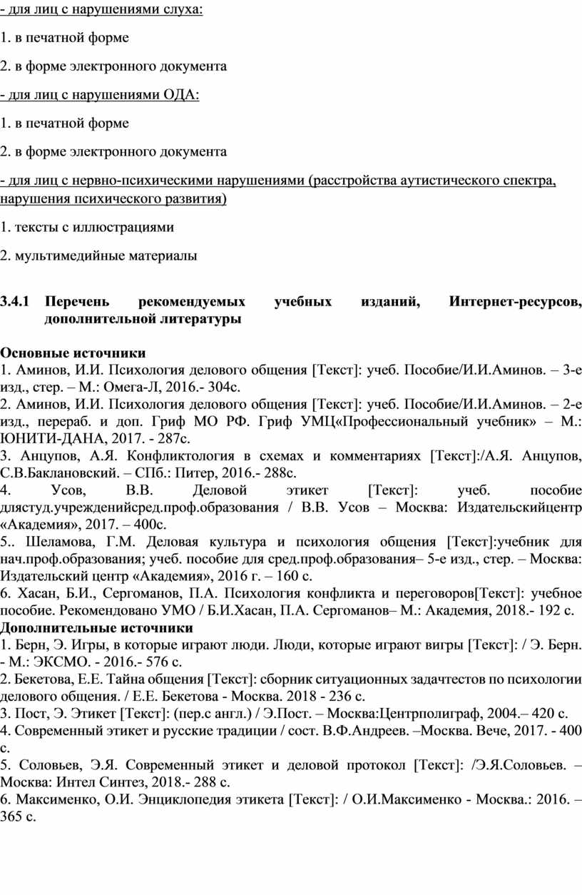 1. Аминов, И.И. Психология делового общения [Текст]: учеб. Пособие/И.И.Аминов. – 3-е изд., стер. – М.: Омега-Л, 2016.- 304с.