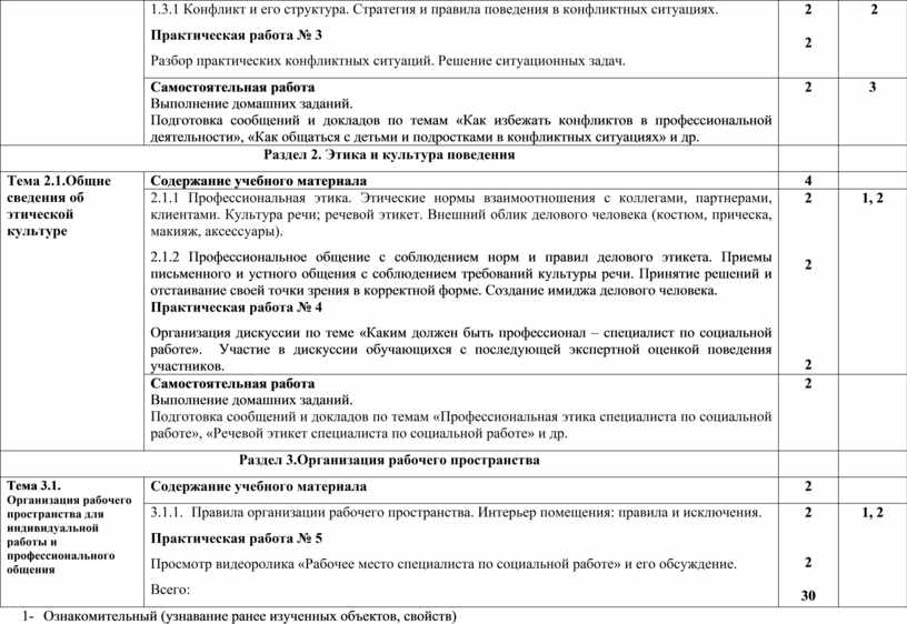 2.1.1 Профессиональная этика. Этические нормы взаимоотношения с коллегами, партнерами, клиентами. Культура речи; речевой этикет. Внешний облик делового человека (костюм, прическа, макияж, аксессуары). 2.1.2 Профессиональное общение с соблюдением норм и правил делового этикета. Приемы письменного и устного общения с соблюдением требований культуры речи. Принятие решений и отстаивание своей точки зрения в корректной форме. Создание имиджа делового человека. Практическая работа № 4 Организация дискуссии по теме «Каким должен быть профессионал – специалист по социальной работе». Участие в дискуссии обучающихся с последующей экспертной оценкой поведения участников. |