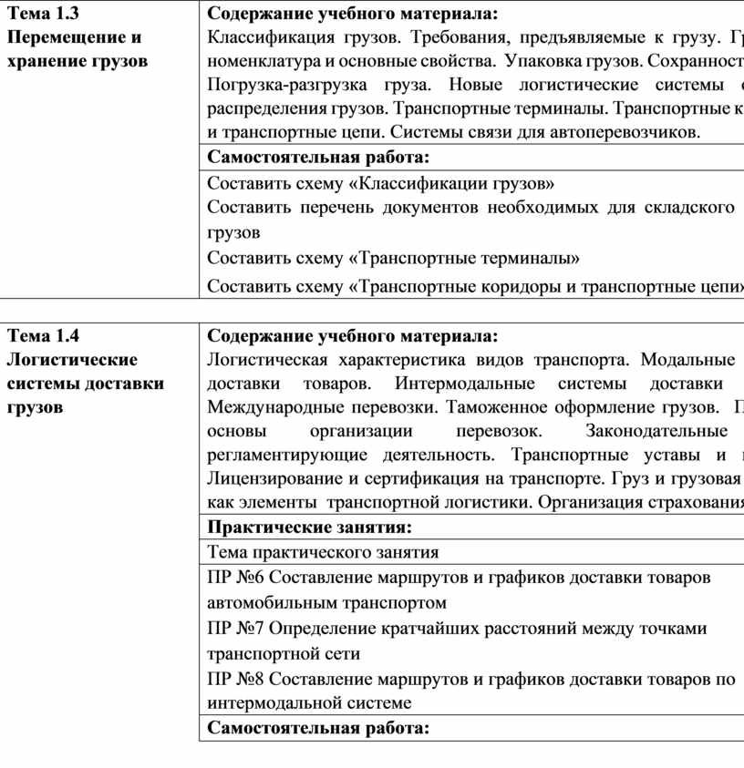 Содержание учебного материала: Содержание: Тенденции транспортно-экспедиционного обеспечения логистики. Организация работы транспортно- экспедиционного предприятия. Логистические компании. Технология экспедирования. Охрана и сопровождение грузов. Согласование экономических интересов участников транспортного процесса использование единых систем планирования. Разработка и применение различных планов-графиков для транспорта. Критерии выбора логистических посредников. Организация автомобильных грузовых перевозок. Организация автомобильных пассажирских перевозок. Правовое регулирование внутренних перевозок грузов. Основные принципы технологии перевозочного процесса. Процесс перевозки грузов ж/д. транспортом. Процесс перевозки грузов автомобильным транспортом. Процесс перевозки грузов морским и речным транспортом. Процесс перевозки грузов авиационным транспортом. Процесс доставки груза трубопроводным транспортом. Проектирование перевозочного процесса. Согласование сроков поставок. Показатели для измерения и эффективности перевозочного процесса. |