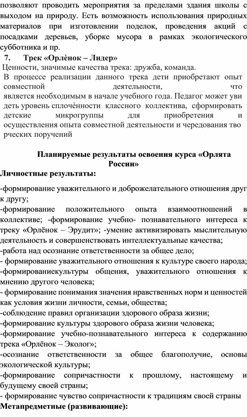 Ценности, значимые качества трека: природа, Родина Символ трека – Рюкзачок эколога Погодные условия в момент реализации трека «Орлѐнок – Эколог» позволяют проводить мероприятия за пределами здания школы с выходом на природу. Есть возможность использования природных материалов при изготовлении поделок, проведения акций с посадками деревьев, уборке мусора в рамках экологического субботника и пр.