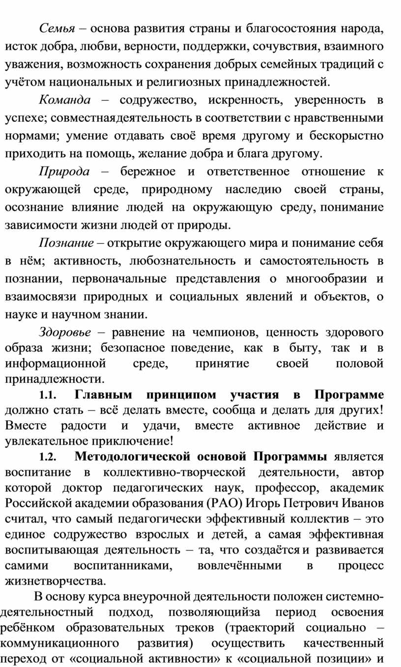 1.2. Методологической основой Программы является воспитание в коллективно-творческой деятельности, автор которой доктор педагогических наук, профессор, академик Российской академии образования (РАО) Игорь Петрович Иванов считал, что самый педагогически эффективный коллектив – это единое содружество взрослых и детей, а самая эффективная воспитывающая деятельность – та, что создаётся и развивается самими воспитанниками, вовлечёнными в процесс жизнетворчества.