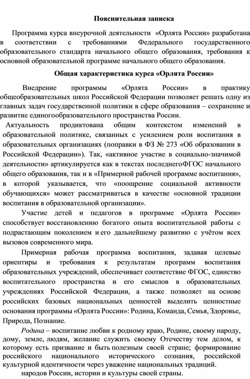 Программа курса внеурочной деятельности «Орлята России» разработана в соответствии с требованиями Федерального государственного образовательного стандарта начального общего образования, требования к основной образовательной программе начального общего образования.