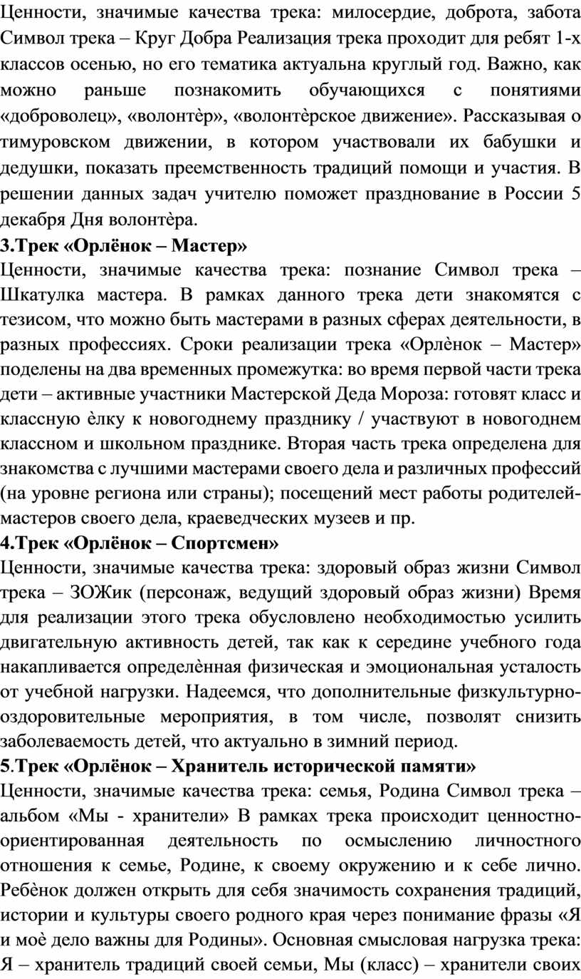 Ценности, значимые качества трека: познание Символ трека – Шкатулка мастера. В рамках данного трека дети знакомятся с тезисом, что можно быть мастерами в разных сферах деятельности, в разных профессиях. Сроки реализации трека «Орлѐнок – Мастер» поделены на два временных промежутка: во время первой части трека дети – активные участники Мастерской Деда Мороза: готовят класс и классную ѐлку к новогоднему празднику / участвуют в новогоднем классном и школьном празднике. Вторая часть трека определена для знакомства с лучшими мастерами своего дела и различных профессий (на уровне региона или страны); посещений мест работы родителей-мастеров своего дела, краеведческих музеев и пр.