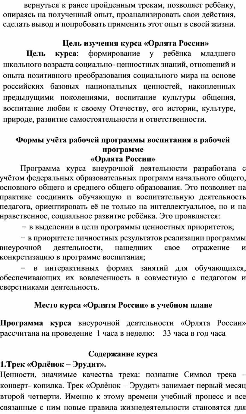 Структура построения курса предлагает богатые возможности для проявления творческой энергии каждого ребёнка, для развития его инициативы, для формирования активной позиции юных граждан страны. В структуре заложено понимание особенностей психологического развития младшего школьника и условия для формирования самостоятельной личности будущего подростка. Учтено соотнесение построения учебных четвертей и распределение нагрузки в них. Цикличность курса, где даётся возможность вернуться к ранее пройденным трекам, позволяет ребёнку, опираясь на полученный опыт, проанализировать свои действия, сделать вывод и попробовать применить этот опыт в своей жизни.