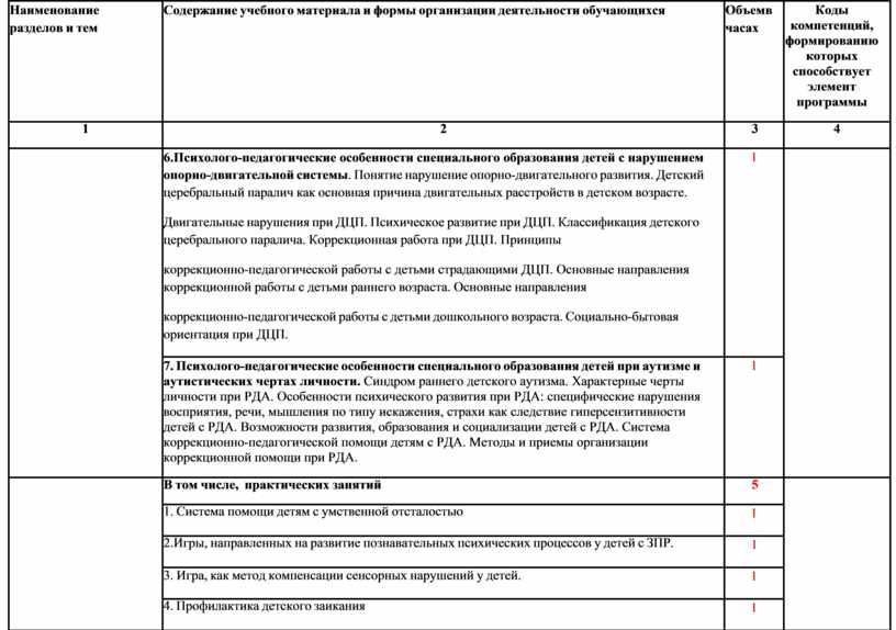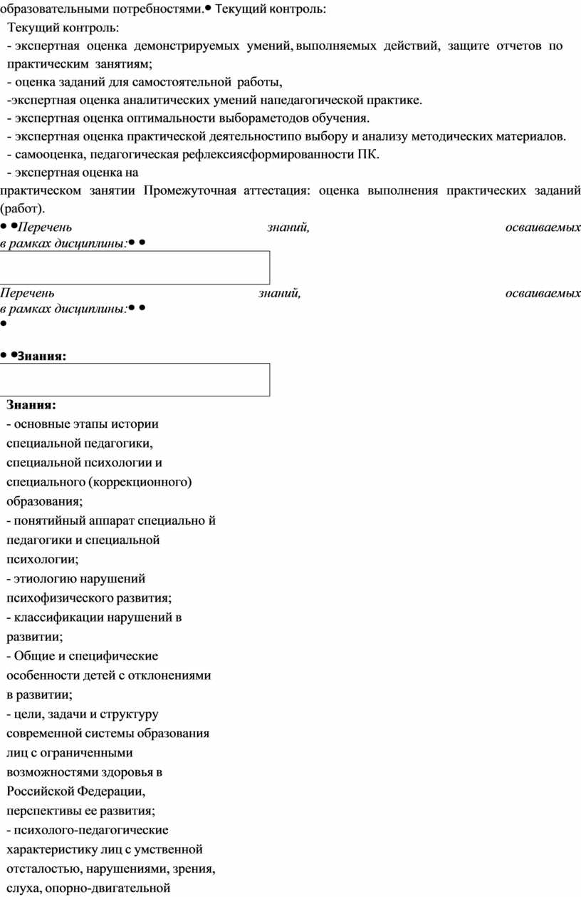 Знания: - основные этапы истории специальной педагогики, специальной психологии и специального (коррекционного) образования; - понятийный аппарат специально й педагогики и специальной психологии; - этиологию нарушений психофизического развития; - классификации нарушений в развитии; - Общие и специфические особенности детей с отклонениями в развитии; - цели, задачи и структуру современной системы образования лиц с ограниченными возможностями здоровья в Российской Федерации, перспективы ее развития; - психолого-педагогические характеристику лиц с умственной отсталостью, нарушениями, зрения, слуха, опорно-двигательной системы, тяжелыми нарушениями речи, задержкой психического развития, недостатками эмоционально-личностных отношений; - цели, задачи, содержание, принципы, методы, средства и формы обучения и воспитания детей с особыми образовательными потребностями; - психолого -педагогические особенности специального (коррекционного) образования детей раннего и дошкольного возраста с умственной отсталостью, нарушениями зрения, слуха, опорно-двигательной системы, тяжелыми нарушениями речи, задержкой психического развития, недостатками эмоционально-личностных отношений; |