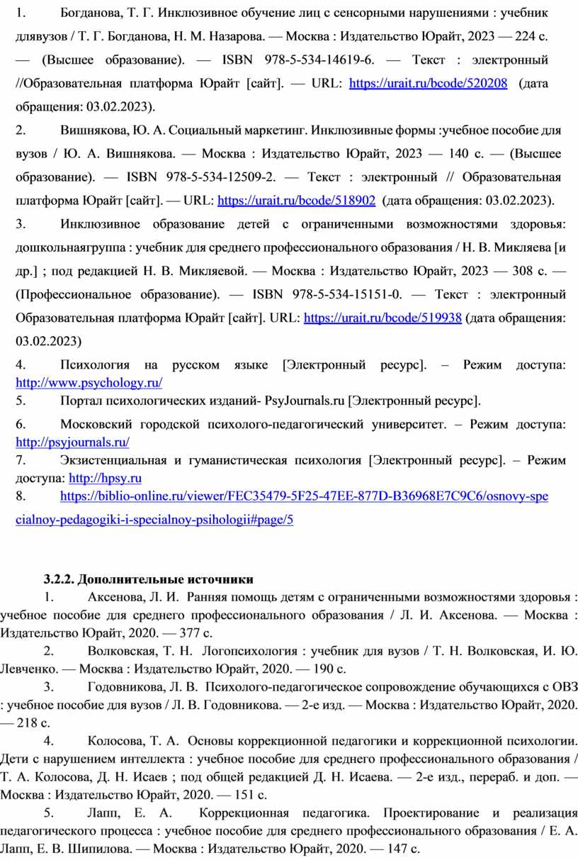 4. Богданова, Т. Г. Инклюзивное обучение лиц с сенсорными нарушениями : учебник для вузов / Т. Г. Богданова, Н. М. Назарова. — Москва : Издательство Юрайт, 2023 — 224 с. — (Высшее образование). — ISBN 978-5-534-14619-6. — Текст : электронный //Образовательная платформа Юрайт [сайт]. — URL: https://urait.ru/bcode/520208 (дата обращения: 03.02.2023).