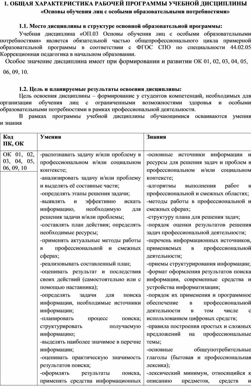 Учебная дисциплина «ОП.03 Основы обучения лиц с особыми образовательными потребностями» является обязательной частью общепрофессионального цикла примерной образовательной программы в соответствии с ФГОС СПО по специальности 44.02.05 Коррекционная педагогика в начальном образовании.