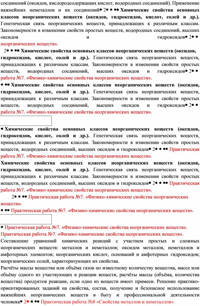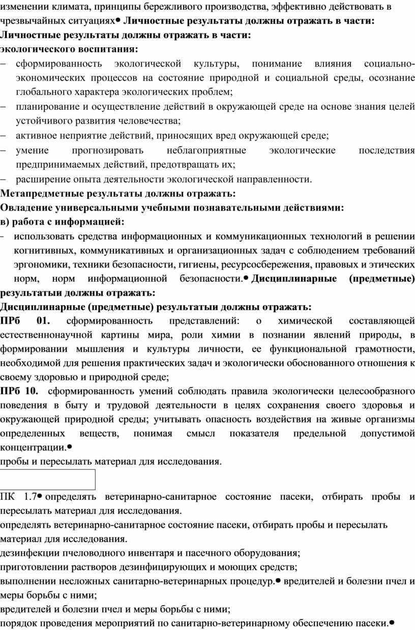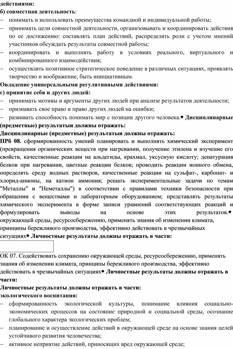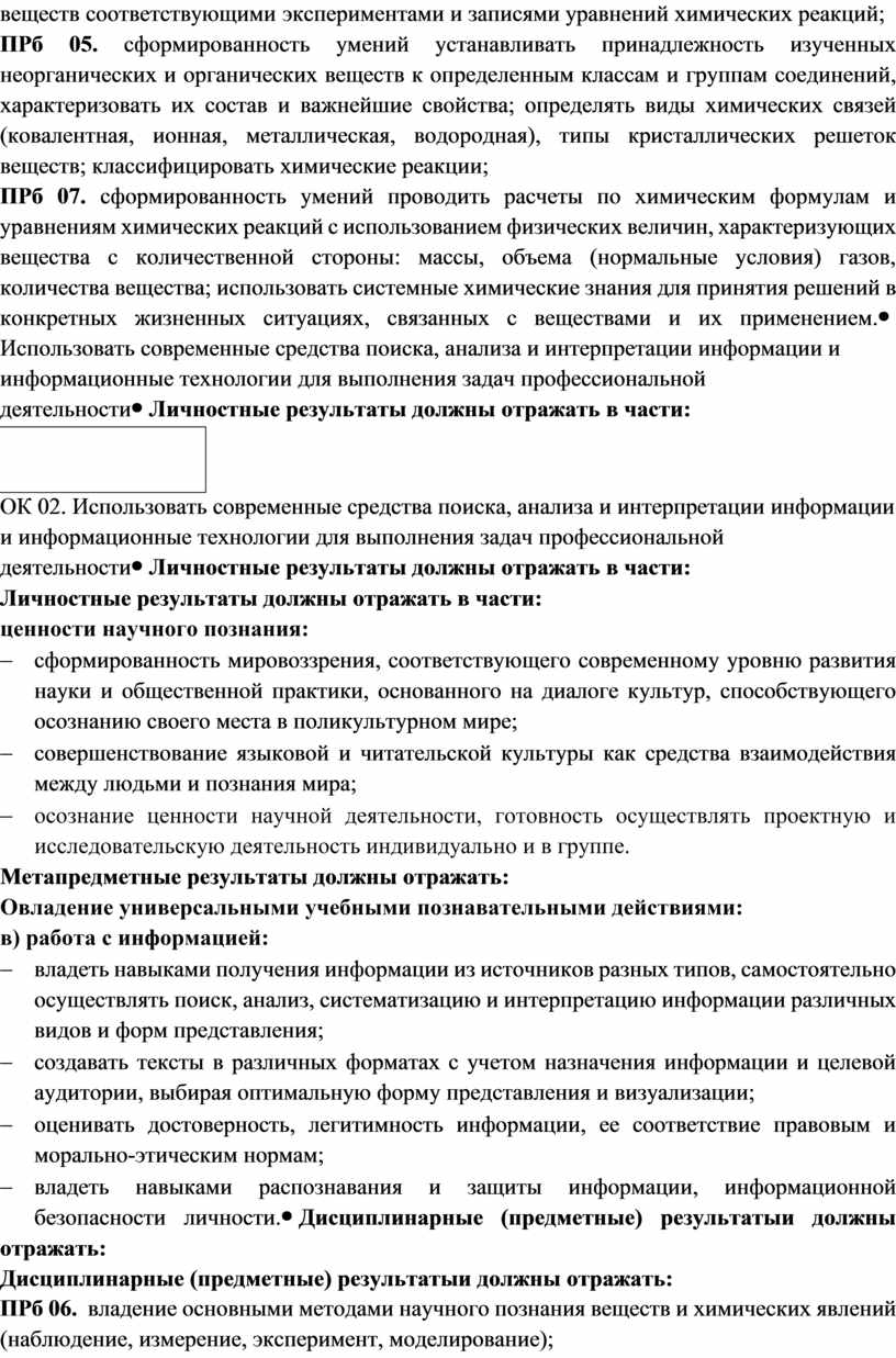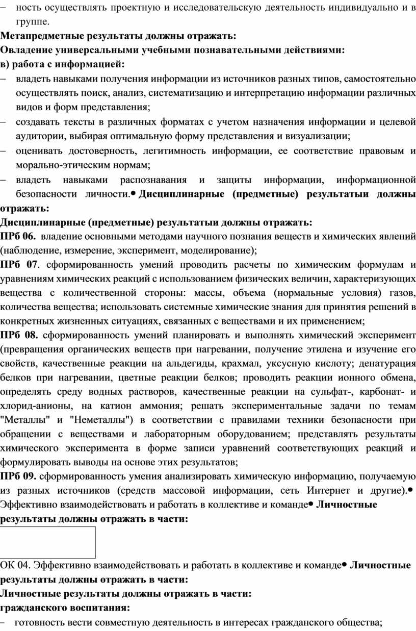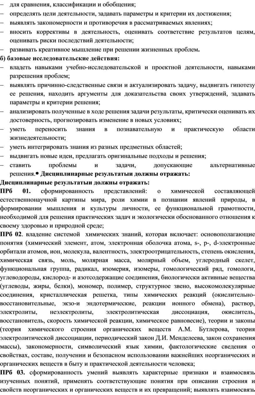 Дисциплинарные результатыи должны отражать: ПРб 01. сформированность представлений: о химической составляющей естественнонаучной картины мира, роли химии в познании явлений природы, в формировании мышления и культуры личности, ее функциональной грамотности, необходимой для решения практических задач и экологически обоснованного отношения к своему здоровью и природной среде; ПРб 02. владение системой химических знаний, которая включает: основополагающие понятия (химический элемент, атом, электронная оболочка атома, s-, р-, d-электронные орбитали атомов, ион, молекула, валентность, электроотрицательность, степень окисления, химическая связь, моль, молярная масса, молярный объем, углеродный скелет, функциональная группа, радикал, изомерия, изомеры, гомологический ряд, гомологи, углеводороды, кислород- и азотсодержащие соединения, биологически активные вещества (углеводы, жиры, белки), мономер, полимер, структурное звено, высокомолекулярные соединения, кристаллическая решетка, типы химических реакций (окислительно-восстановительные, экзо-и эндотермические, реакции ионного обмена), раствор, электролиты, неэлектролиты, электролитическая диссоциация, окислитель, восстановитель, скорость химической реакции, химическое равновесие), теории и законы (теория химического строения органических веществ A.M. Бутлерова, теория электролитической диссоциации, периодический закон Д.И. Менделеева, закон сохранения массы), закономерности, символический язык химии, фактологические сведения о свойствах, составе, получении и безопасном использовании важнейших неорганических и органических веществ в быту и практической деятельности человека; ПРб 03. сформированность умений выявлять характерные признаки и взаимосвязь изученных понятий, применять соответствующие понятия при описании строения и свойств неорганических и органических веществ и их превращений; выявлять взаимосвязь химических знаний с понятиями и представлениями других естественнонаучных предметов; ПРб 04. сформированность умений использовать наименования химических соединений международного союза теоретической и прикладной химии и тривиальные названия важнейших веществ (этилен, ацетилен, глицерин, фенол, формальдегид, уксусная кислота, глицин, угарный газ, углекислый газ, аммиак, гашеная известь, негашеная известь, питьевая сода и других), составлять формулы неорганических и органических веществ, уравнения химических реакций, объяснять их смысл; подтверждать характерные химические свойства веществ соответствующими экспериментами и записями уравнений химических реакций; ПРб 05. сформированность умений устанавливать принадлежность изученных неорганических и органических веществ к определенным классам и группам соединений, характеризовать их состав и важнейшие свойства; определять виды химических связей (ковалентная, ионная, металлическая, водородная), типы кристаллических решеток веществ; классифицировать химические реакции; ПРб 07. сформированность умений проводить расчеты по химическим формулам и уравнениям химических реакций с использованием физических величин, характеризующих вещества с количественной стороны: массы, объема (нормальные условия) газов, количества вещества; использовать системные химические знания для принятия решений в конкретных жи