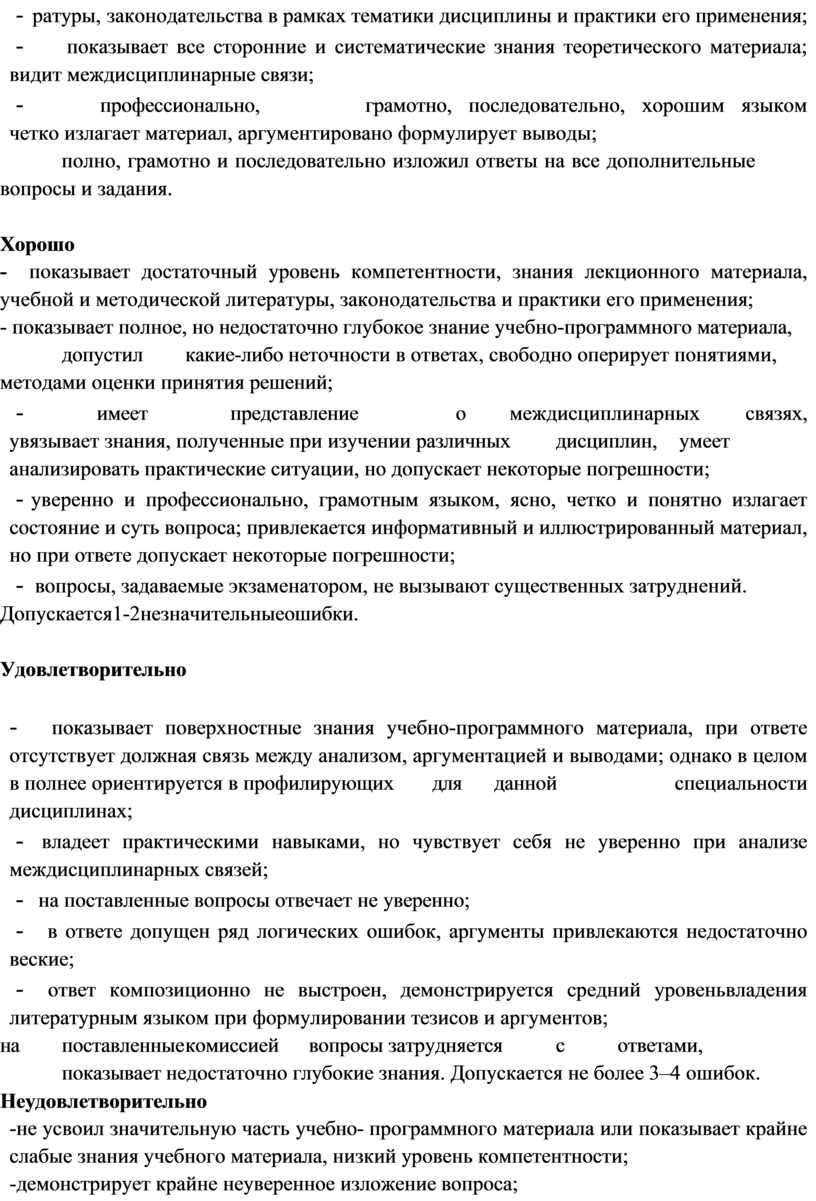 - показывает поверхностные знания учебно-программного материала, при ответе отсутствует должная связь между анализом, аргументацией и выводами; однако в целом в полнее ориентируется в профилирующих для данной специальности дисциплинах;