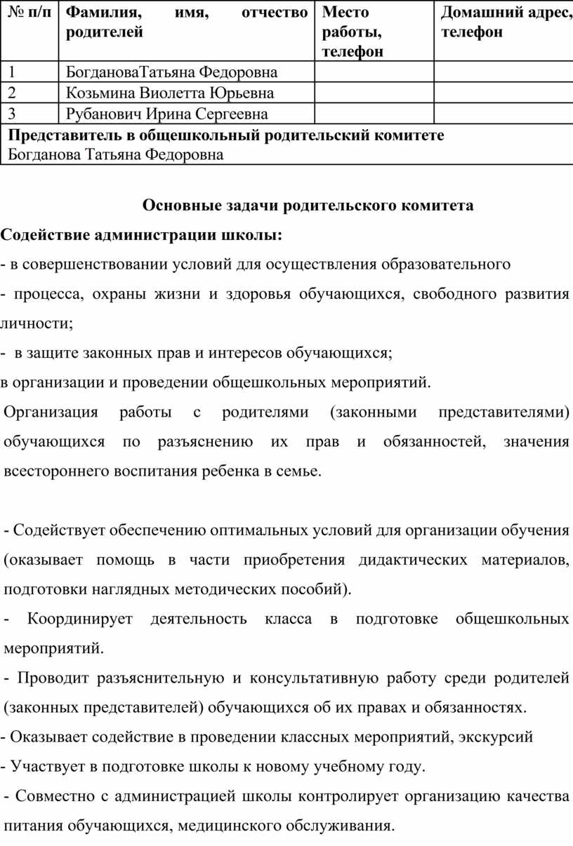 Основные задачи родительского комитета