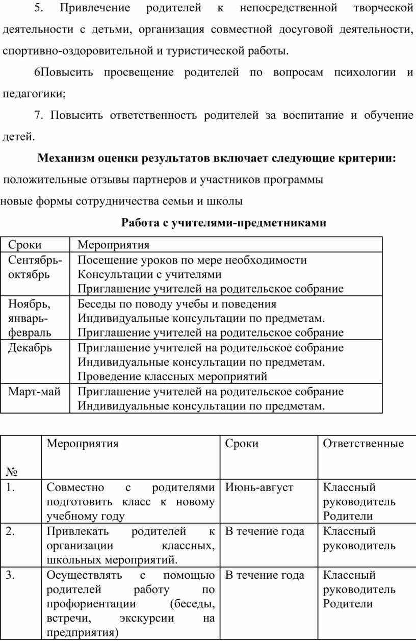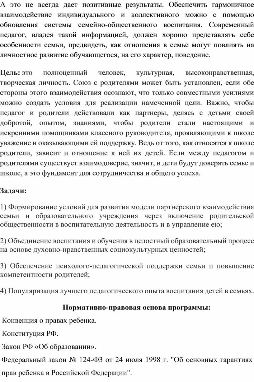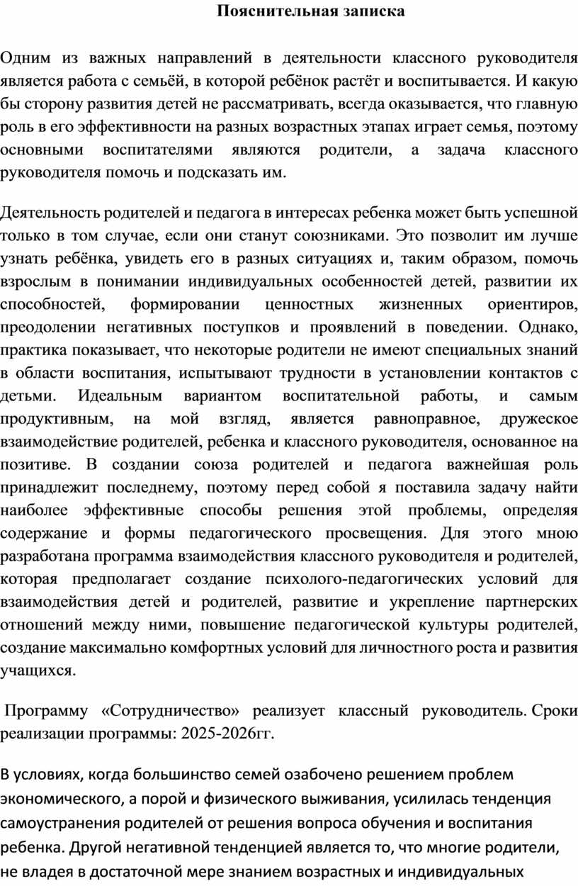 Деятельность родителей и педагога в интересах ребенка может быть успешной только в том случае, если они станут союзниками. Это позволит им лучше узнать ребёнка, увидеть его в разных ситуациях и, таким образом, помочь взрослым в понимании индивидуальных особенностей детей, развитии их способностей, формировании ценностных жизненных ориентиров, преодолении негативных поступков и проявлений в поведении. Однако, практика показывает, что некоторые родители не имеют специальных знаний в области воспитания, испытывают трудности в установлении контактов с детьми. Идеальным вариантом воспитательной работы, и самым продуктивным, на мой взгляд, является равноправное, дружеское взаимодействие родителей, ребенка и классного руководителя, основанное на позитиве. В создании союза родителей и педагога важнейшая роль принадлежит последнему, поэтому перед собой я поставила задачу найти наиболее эффективные способы решения этой проблемы, определяя содержание и формы педагогического просвещения. Для этого мною разработана программа взаимодействия классного руководителя и родителей, которая предполагает создание психолого-педагогических условий для взаимодействия детей и родителей, развитие и укрепление партнерских отношений между ними, повышение педагогической культуры родителей, создание максимально комфортных условий для личностного роста и развития учащихся.