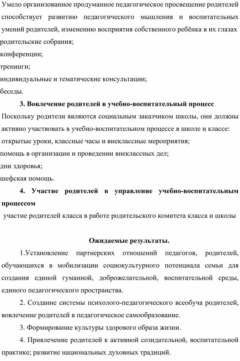 4. Привлечение родителей к активной созидательной, воспитательной практике; развитие национальных духовных традиций.