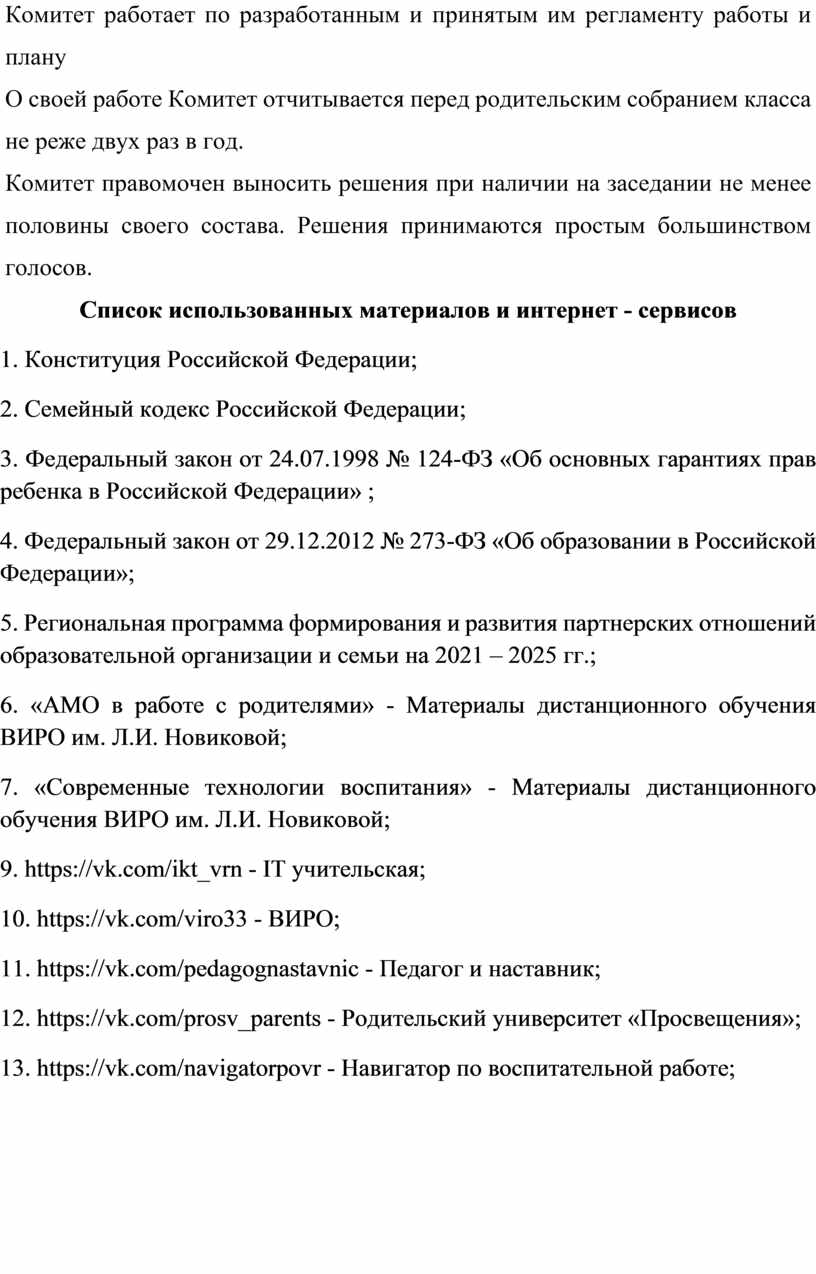 Комитет работает по разработанным и принятым им регламенту работы и плану