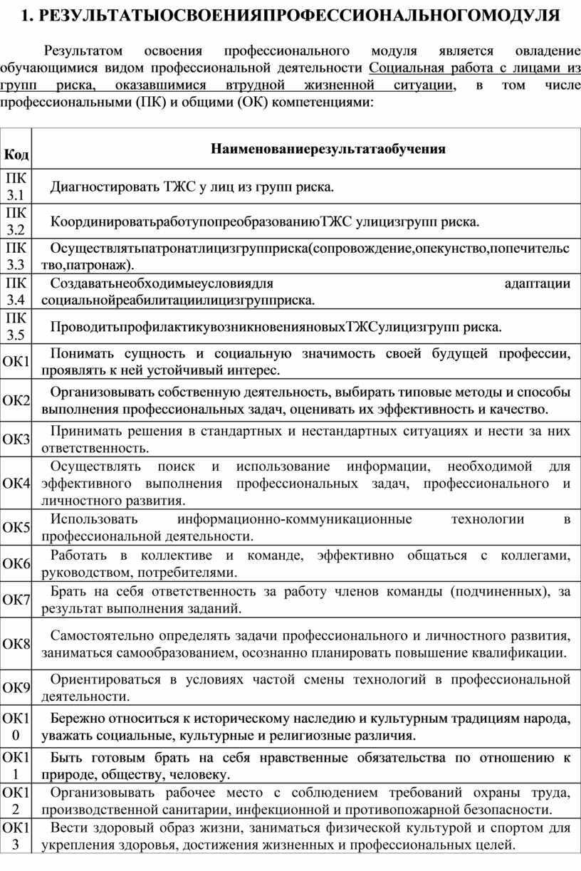 Результатом освоения профессионального модуля является овладение обучающимися видом профессиональной деятельности Социальная работа с лицами из групп риска, оказавшимися втрудной жизненной ситуации, в том числе профессиональными (ПК) и общими (ОК) компетенциями: