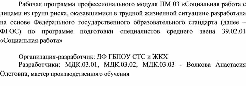 Рабочая программа профессионального модуля ПМ 03 «Социальная работа с лицами из групп риска, оказавшимися в трудной жизненной ситуации» разработана на основе Федерального государственного образовательного стандарта (далее – ФГОС) по программе подготовки специалистов среднего звена 39.02.01 «Социальная работа»