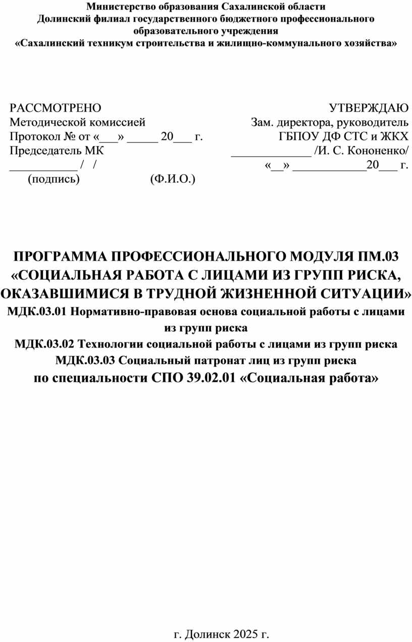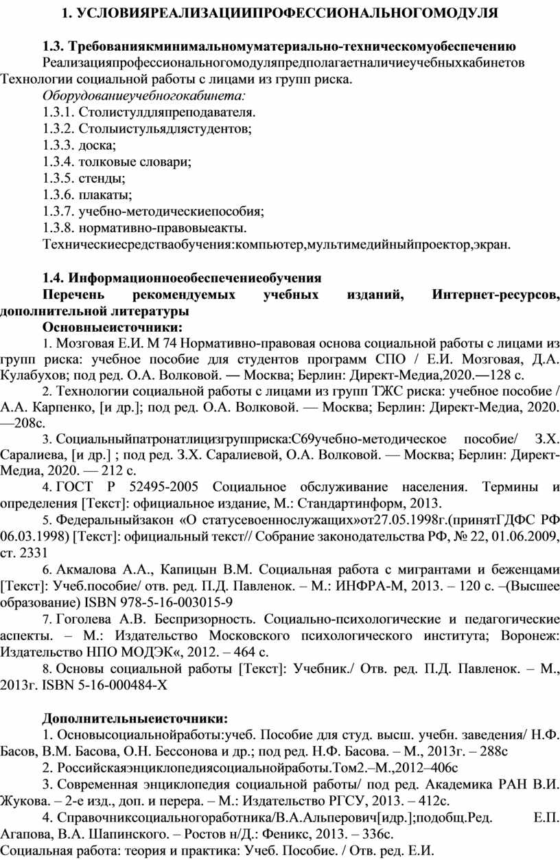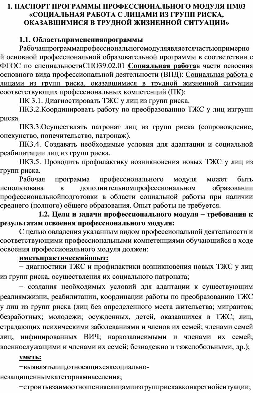 1. ПАСПОРТ ПРОГРАММЫ ПРОФЕССИОНАЛЬНОГО МОДУЛЯ ПМ03 «СОЦИАЛЬНАЯ РАБОТА С ЛИЦАМИ ИЗ ГРУПП РИСКА, ОКАЗАВШИМИСЯ В ТРУДНОЙ ЖИЗНЕННОЙ СИТУАЦИИ»