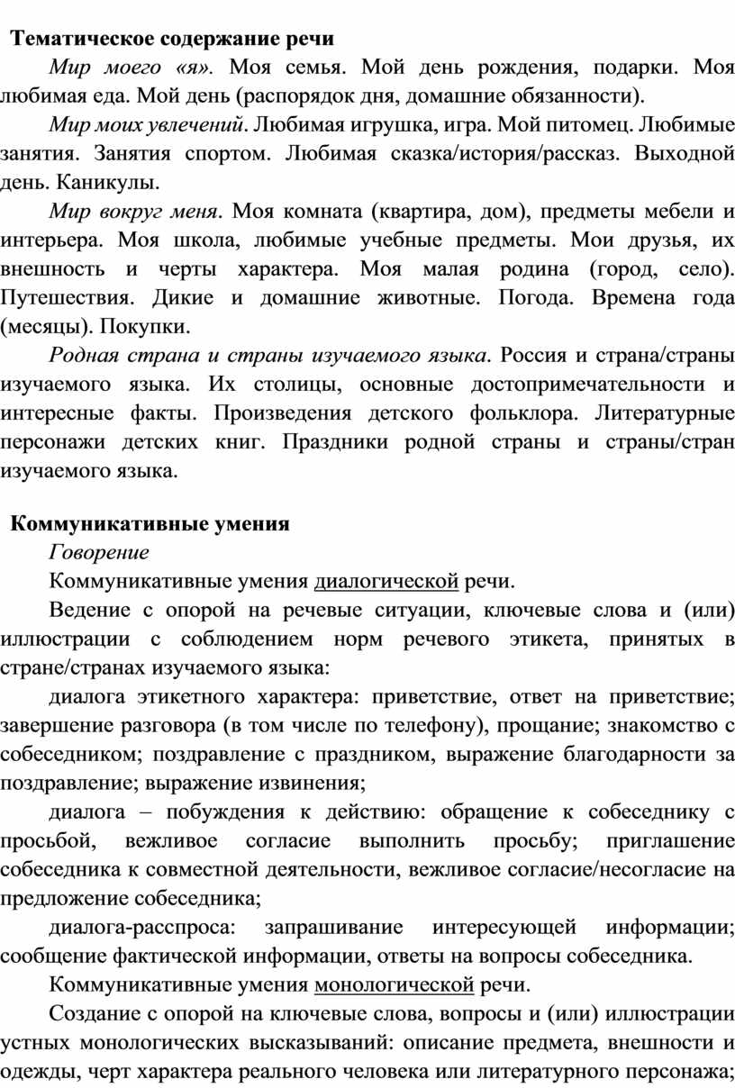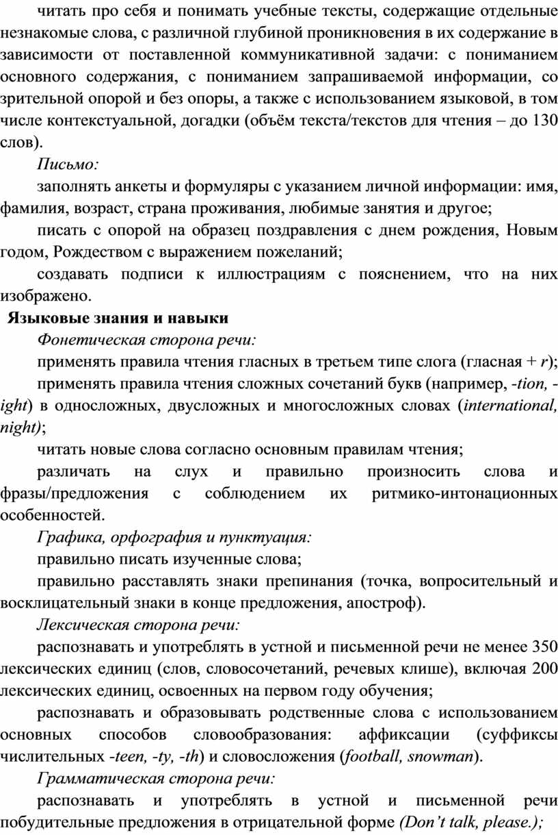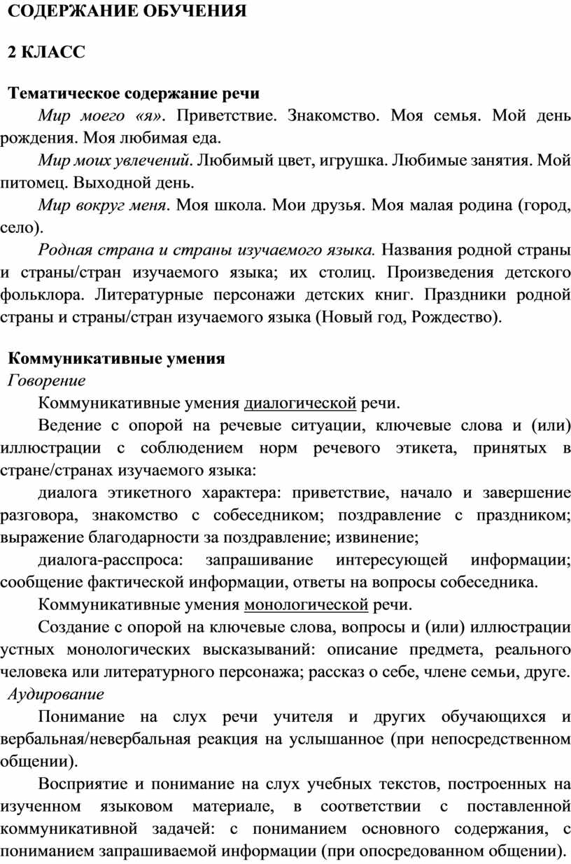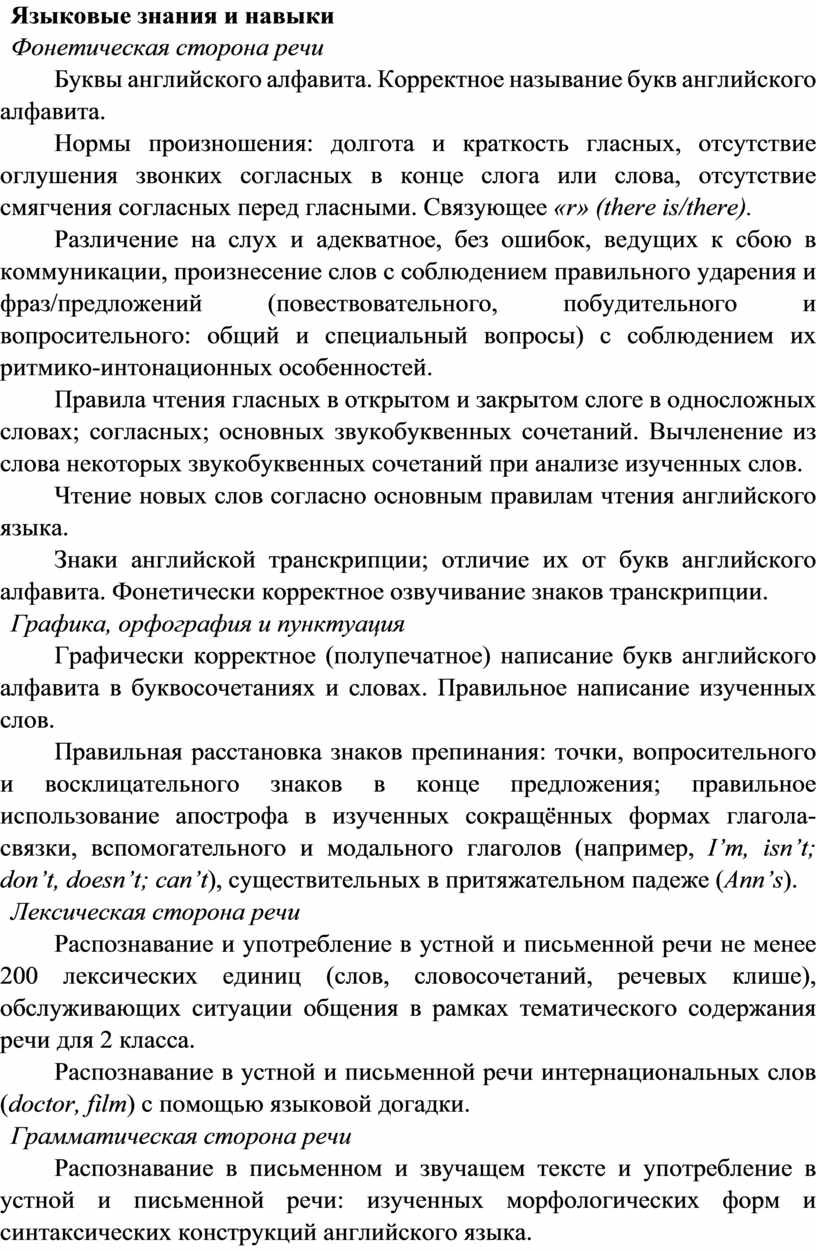 Распознавание и употребление в устной и письменной речи не менее 200 лексических единиц (слов, словосочетаний, речевых клише), обслуживающих ситуации общения в рамках тематического содержания речи для 2 класса.