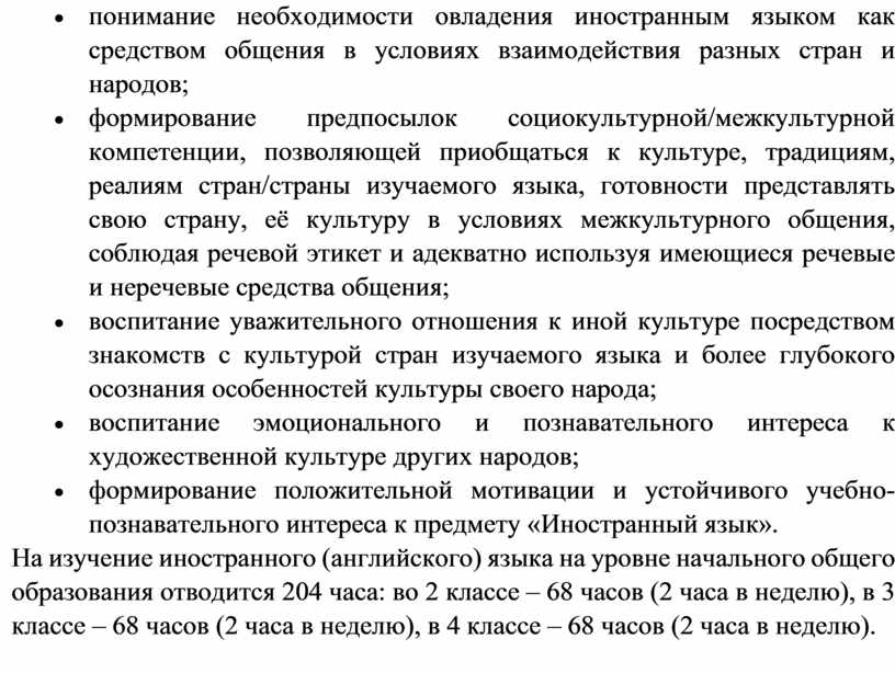 На изучение иностранного (английского) языка на уровне начального общего образования отводится 204 часа: во 2 классе – 68 часов (2 часа в неделю), в 3 классе – 68 часов (2 часа в неделю), в 4 классе – 68 часов (2 часа в неделю).