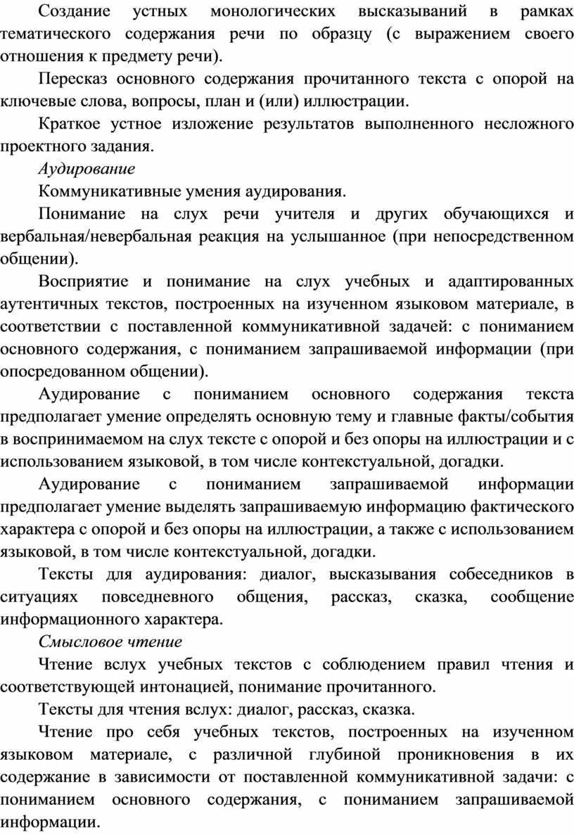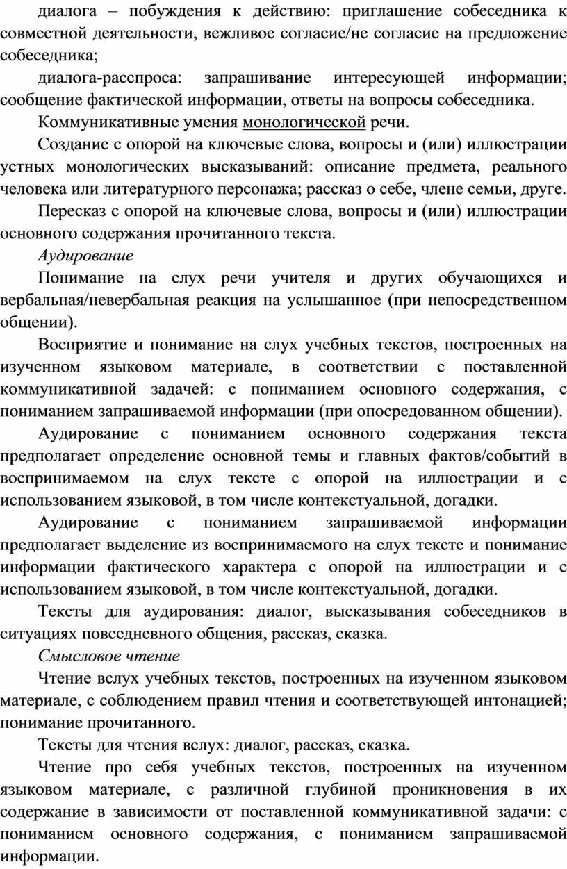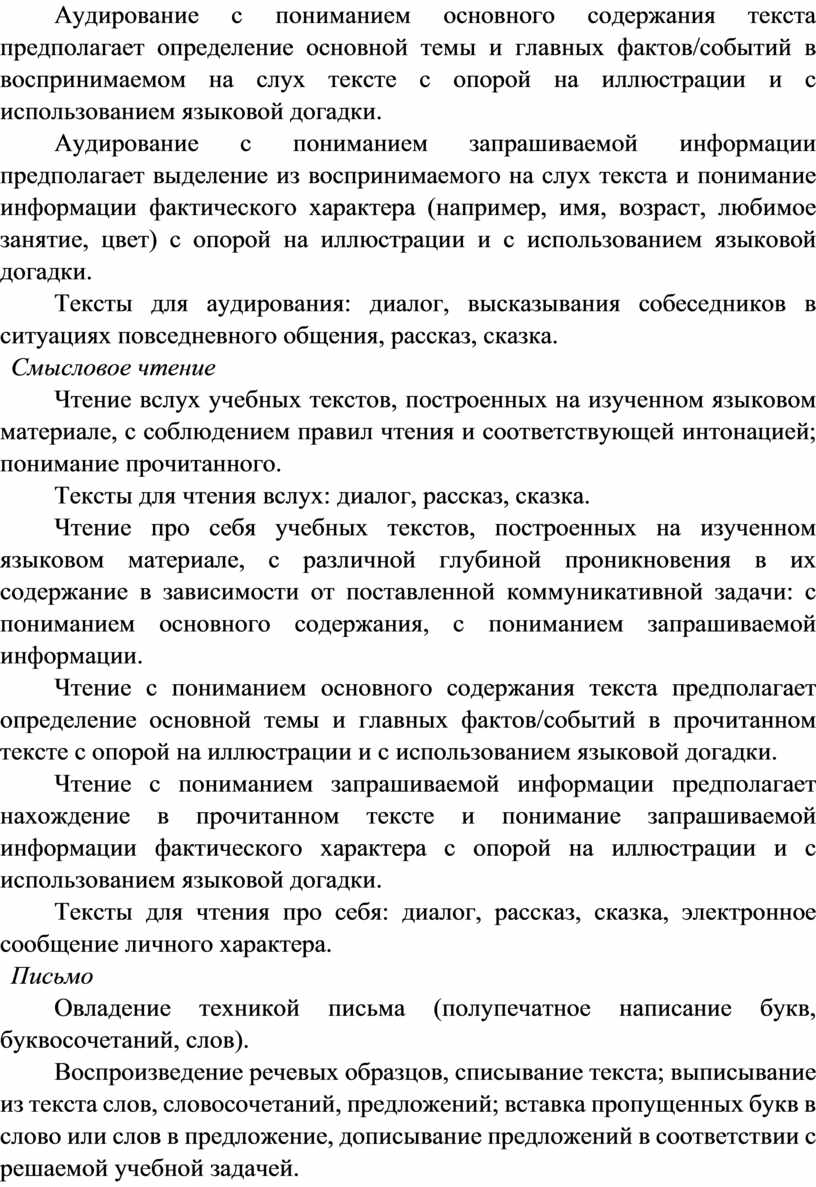 Аудирование с пониманием запрашиваемой информации предполагает выделение из воспринимаемого на слух текста и понимание информации фактического характера (например, имя, возраст, любимое занятие, цвет) с опорой на иллюстрации и с использованием языковой догадки.